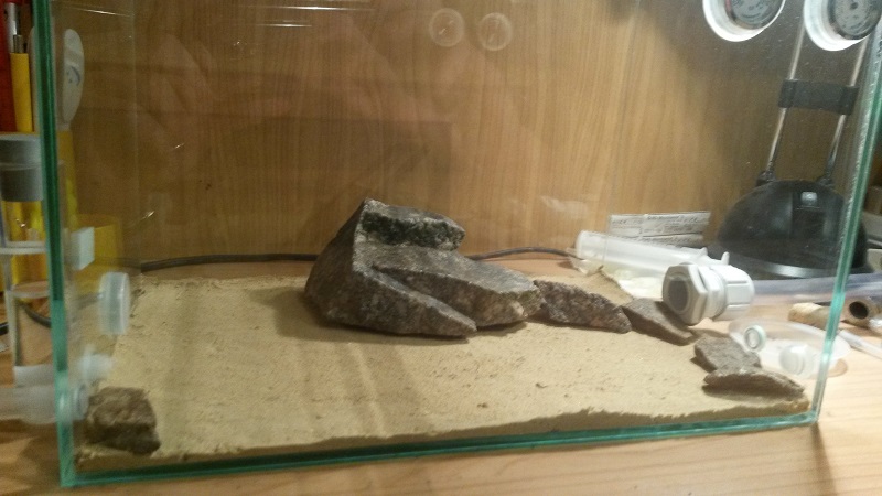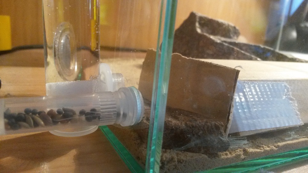 Über einen 1m Schlauch (Durchmesser 10mm) ist eine Farm mit Sand-Lehm Mischung angeschlossen. An die Rückseite der Farm ist eine 7 Watt Heizmatte mit Tesa Film geklebt, welches das Nest einseitig auf 27°-30°C erwärmt (Temperatur schwankt je nach Außentemperatur). Bild habe ich hierzu keines, da es da nichts großartiges zu sehen gibt^^.