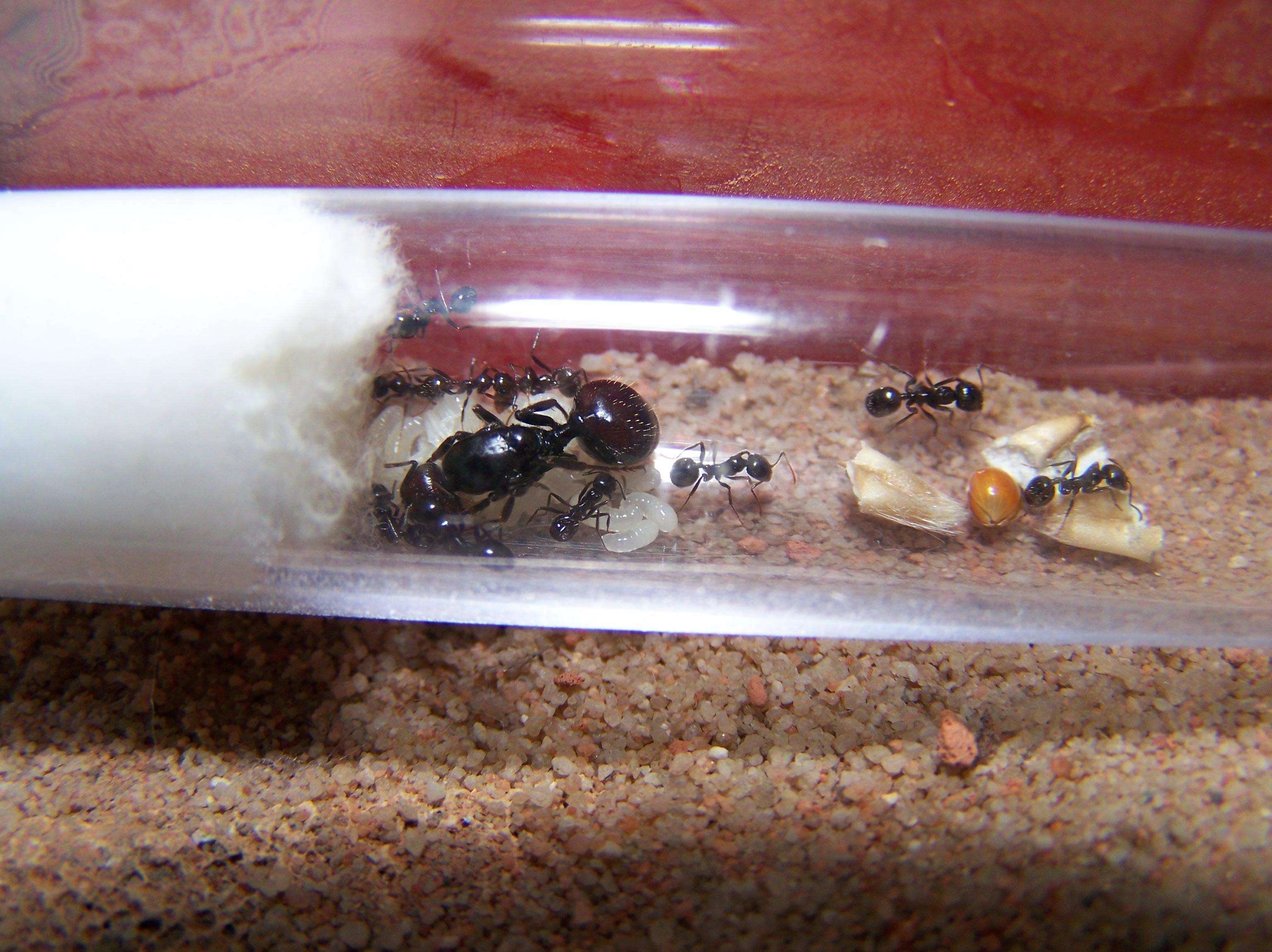 Zwei Bilder einer kleinen Messor barbarus Kolonie nach einem Zwangsauszug aus dem Reagenzglas. Es herrscht groĂe Ratlosigkeit, alles tragbare wurde in die Mitte der Tupperbox verfrachtet, darunter auch eine tote Arbeiterin. Schön zu beobachten war die absolute Agilheit der Königin , die es nicht scheut sich alleine auf Entdeckungstour zu begeben. Weitere Bilder werden in einigen Tagen oder Wochen folgen, sobald die neuen Arbeiter geschlĂŒpft sind.