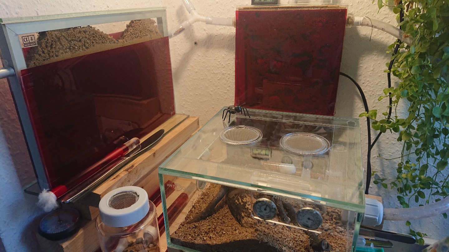Nachdem ich gestern das alte, neu hergerichtete Nest angeschlossen habe ist gut was los. Es wurde super angenommen und es sind geschätzt 20 Damen dauerhaft am buddeln. Sie haben schon ordentlich Land bewegt was man an dem aushub oberhalb der roten Folie sehen kann. Nachdem ich vorgestern 4 Verluste aus der Arena entfernt habe, waren es gestern 3 und heute nur eine tote Ameise.