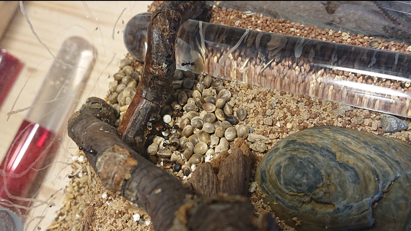 Des weiteren scheint das Sand Lehm Gemisch im Nest entweder ein zu brechen oder sie graben es einfach weg. Kann mir ersteres nicht erklären da ich es an gedrückt und befeuchtet habe, Schicht für Schicht. Vergleicht man die Bilder von meinem ersten Post kann man das Ausmaß erkennen. Eventuell lagern sie deswegen die Samen teilweise in der Arena.