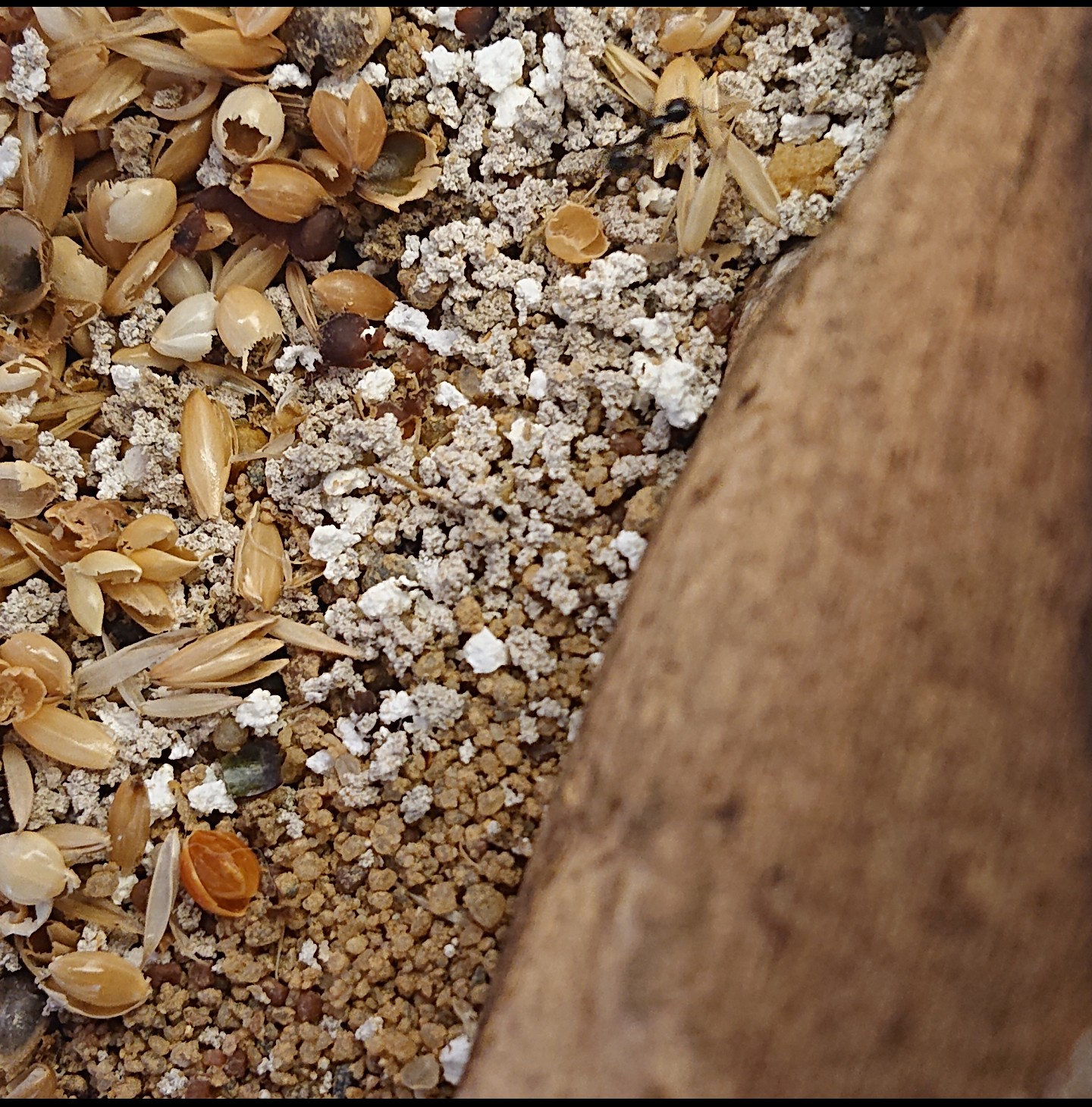 Ich füttere eine Kanarienvögel Futtermischung mit zusätzlichen Hanfsamen wegen der Proteine und Grassamen die noch aus der Anfangszeit über sind. Desweiteren hin und wieder anderweitige Proteine wie überbrühte Steppengrillen oder Brummer die uns nerven. Des Weiteren hatte ich im Starterset diverse Futterröhrchen wovon sie nur das PI als Insektenprotein annehmen.