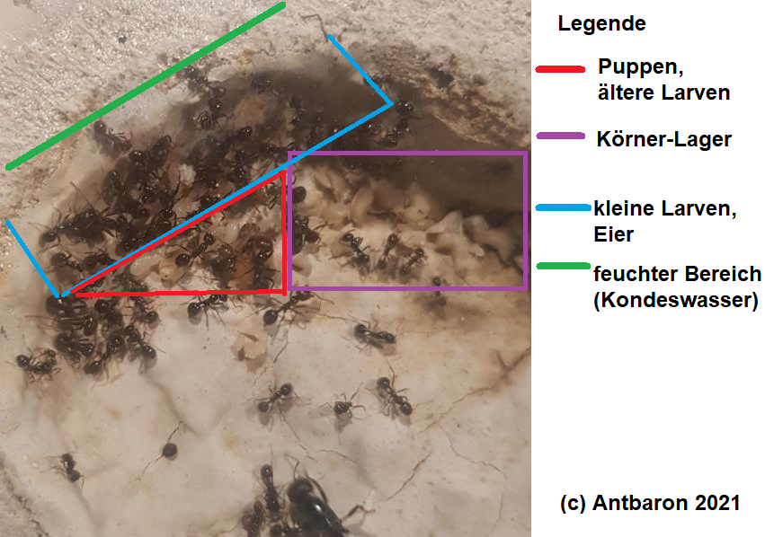 .. im Vergleich zu abgedunkelten Nestern ist jedoch oft ein erheblich vermehrtes Umhertragen „und Bewachen“ der Brut zu beobachten, auf Kosten der Nahrungssuche und eigentlichen Brutpflege! Wer Zweifel hat, möge seinen „an Licht gewöhnten“ Ameisen eine gleichartige, aber dunkle Nistgelegenheit zur Auswahl anbieten!