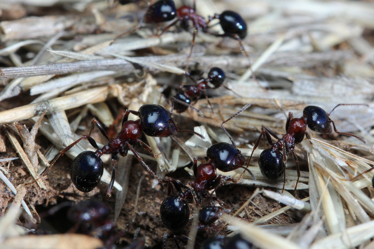 5. Gruppenbild v. M. wasmanni in unmittelbarer NĂ€he d. Nesteinganges. Der Rotanteil am Mesosoma ist nicht immer so ausgeprĂ€gt und groĂflĂ€chig wie bei diesen Individuen, aber sie sind immer zweifĂ€rbig!