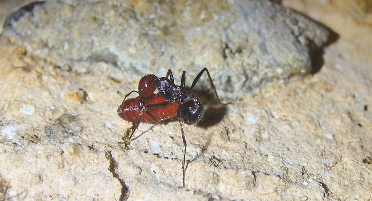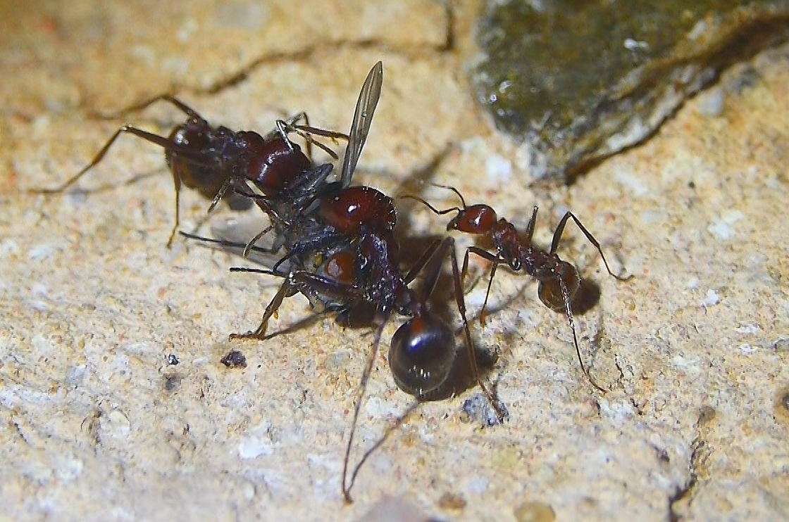 Normal sind schlĂĽpfende Fliegen von Messor cephalotes nicht zu erwischen, die sind einfach zu flink und schnell.