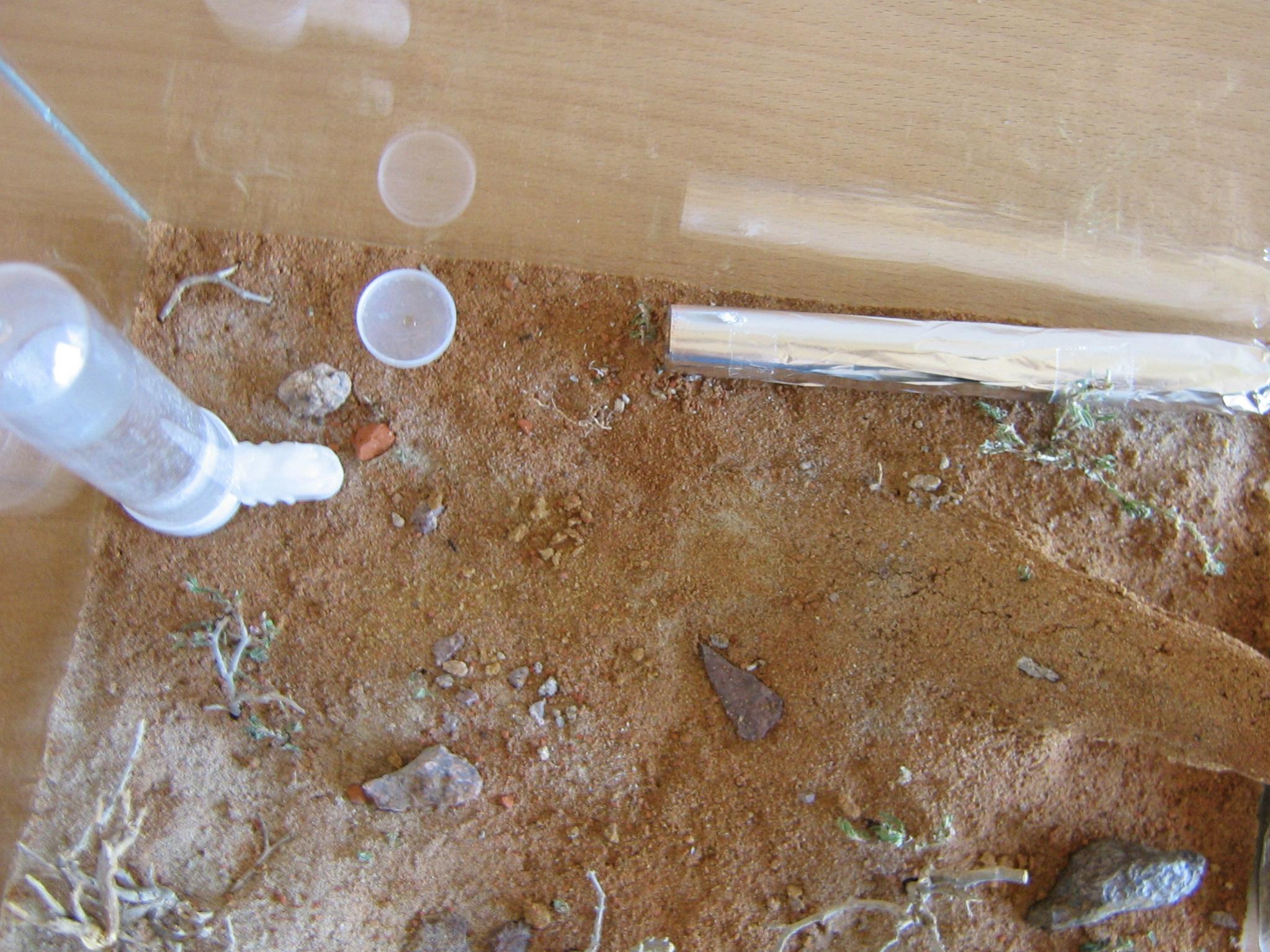Nach einem Tag Trocknungsphase (der Silikon ist schnelltrocknend) habe ich eine passgenaue Plastikfolie und den Schlauch ebenfalls mit Silikon festgeklebt, wobei ich zuvor das Nest noch mit Gips ausgestrichen habe. Zu dem Gibs habe ich ins Nestinnere noch Sand gestreut, damit die Kolonie eventuelle Löcher und Unebenheiten beseitigen kann. Unter dem Nest befindet sich eine Säule, die auch aus Ytongstein besteht. Das war der Baubericht im Haltungbericht!:D