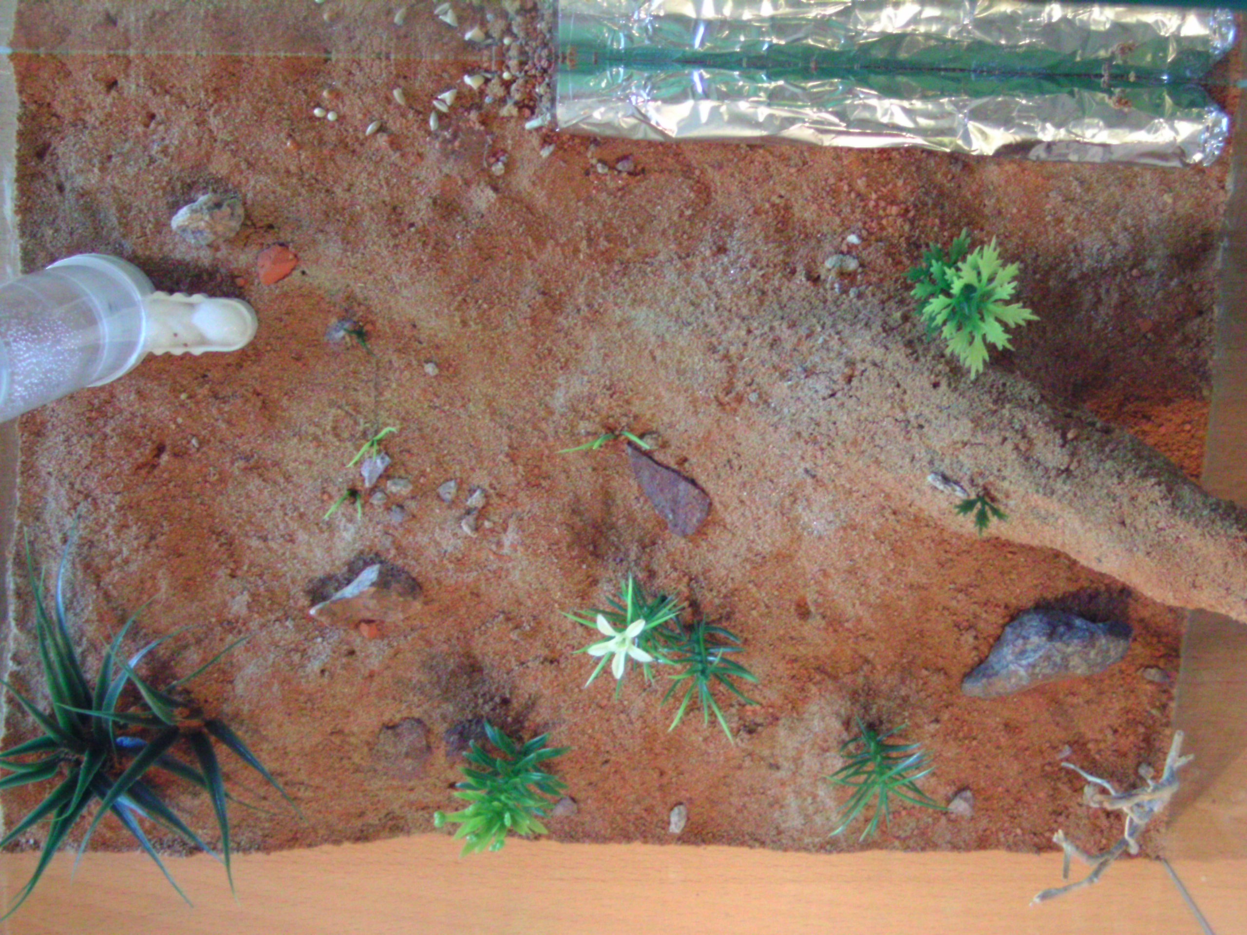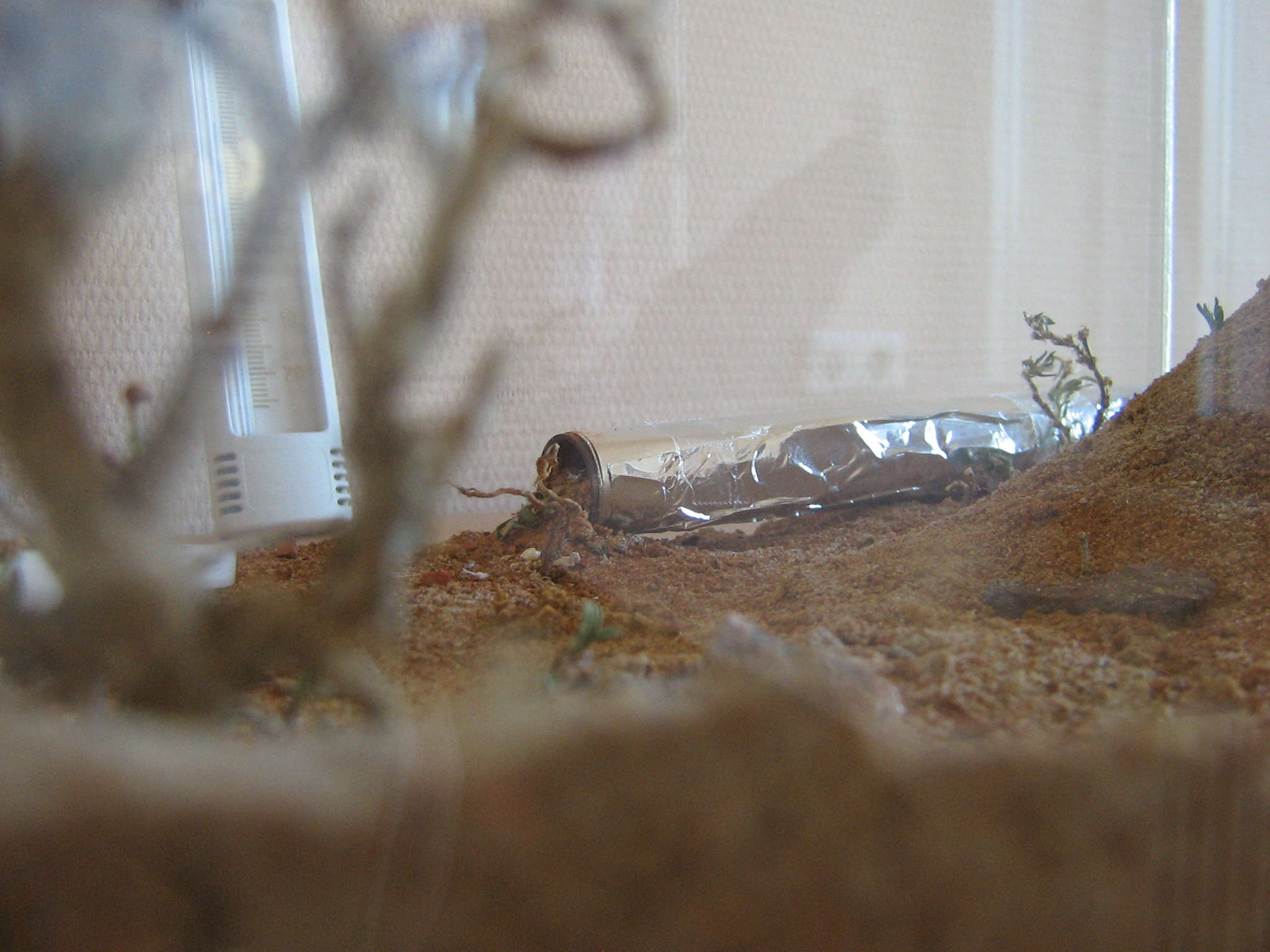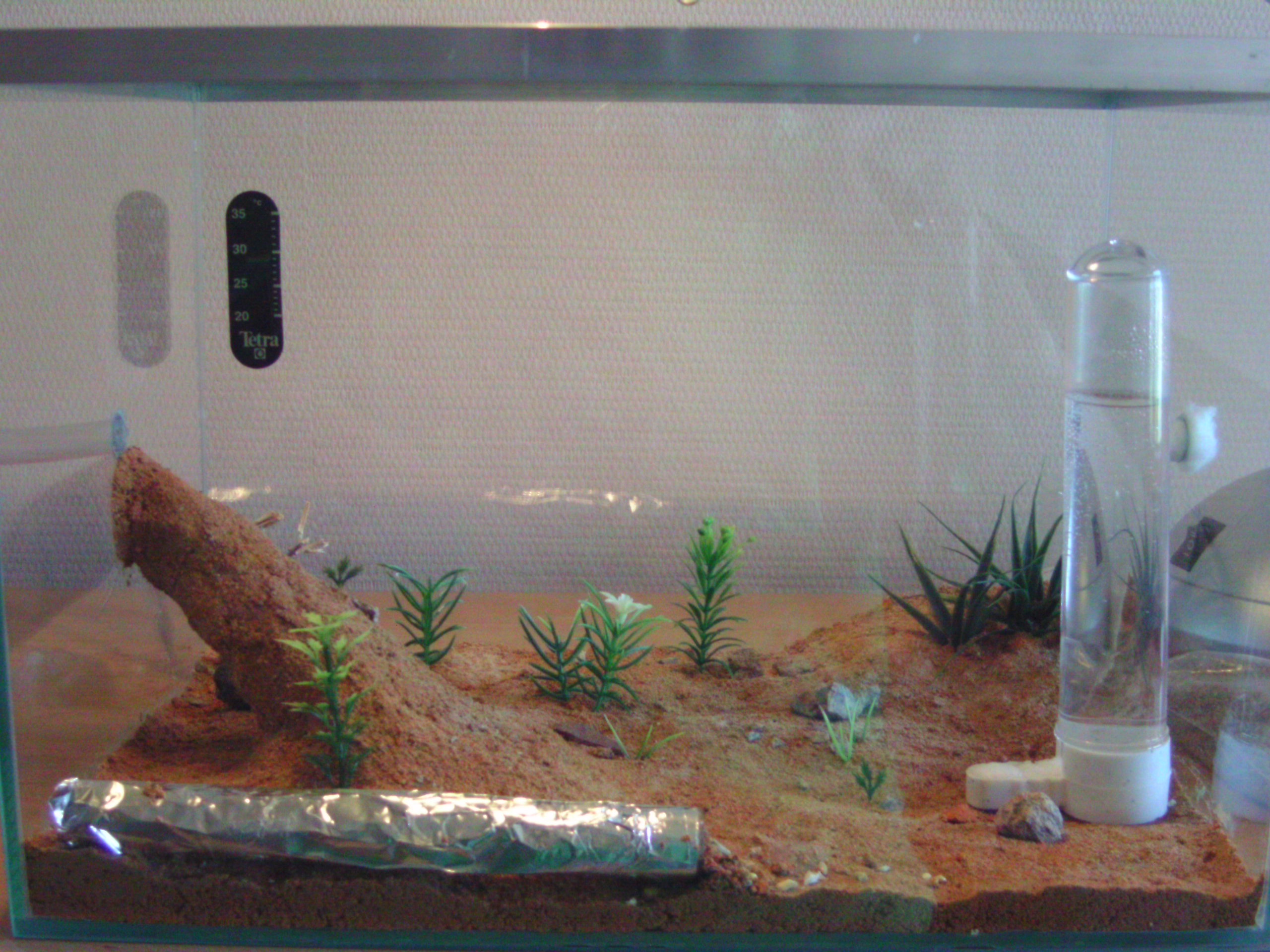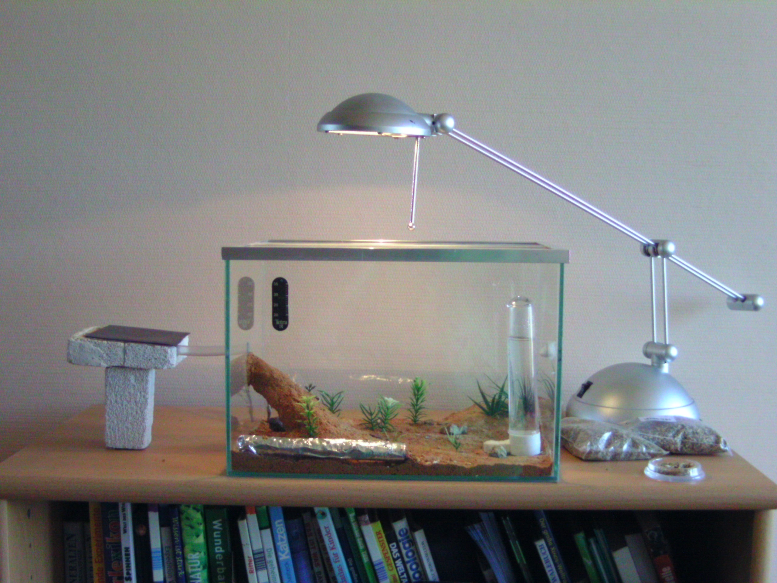Dazu habe ich eine Schreibtischlampe an die Zeitschaltuhr gekoppelt um einen Tag und Nachtrythmus zu simulieren. Die Lampe schaltet sich in Interwallen von einer halben Stunde immer an und aus und geht morgens um 9:30 Uhr an und abends um 7:00 Uhr aus. Die Termeratur schwankt nun je nach Zimmertemperatur zwischen 26 und 31 °C. Das ist die ideale Temperatur.