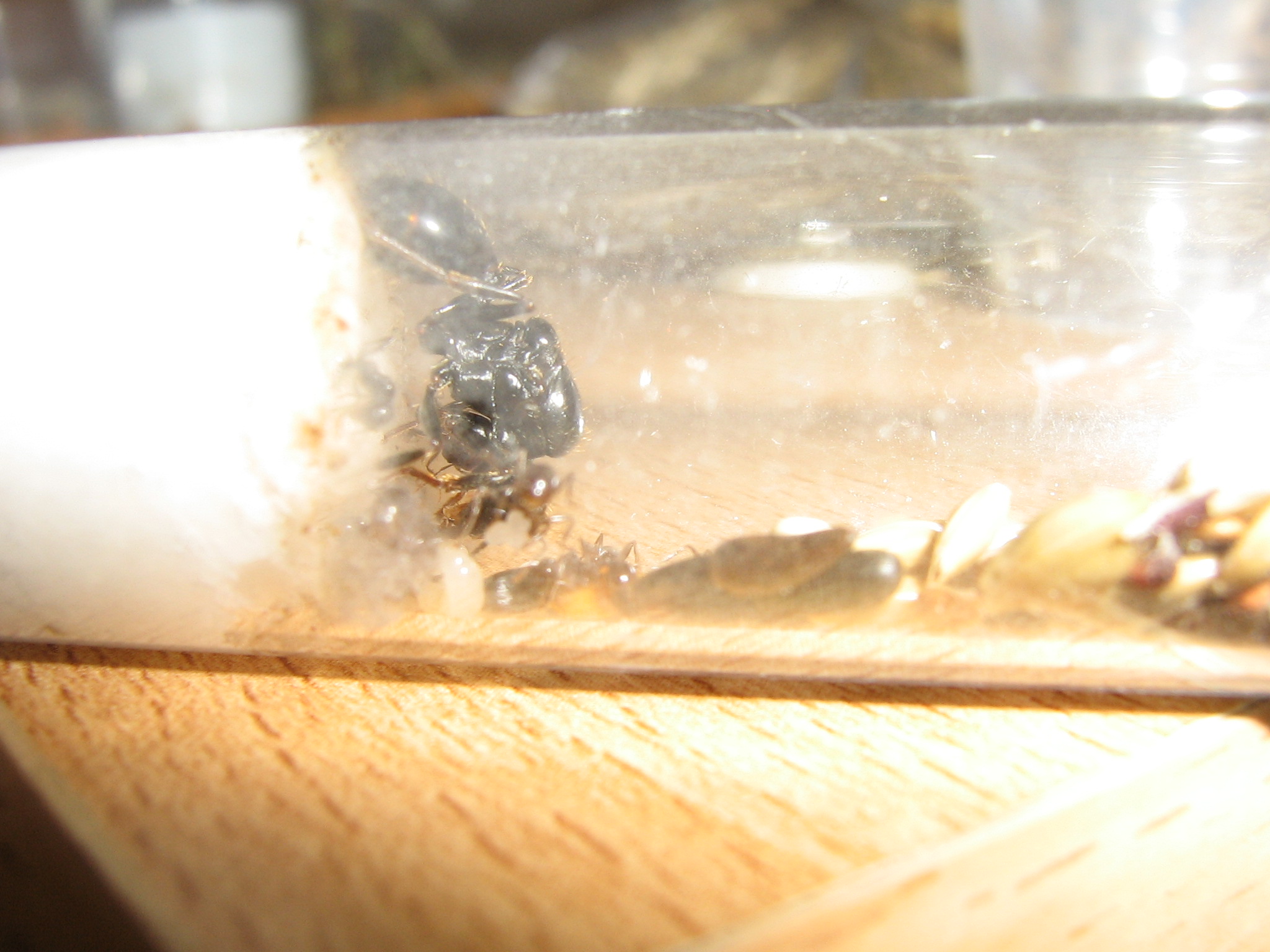 DerGyne und den Arbeiterinnen (12 Stück) geht es gut. Sie zeigen ein normales Verhalten. Die Gaster von ein paar Arbeiterinnen sind Prall. Auch eine Menge Körner sind eingelagert. Fast das ganze Rg ist damit zugestopft:fettgrins:.