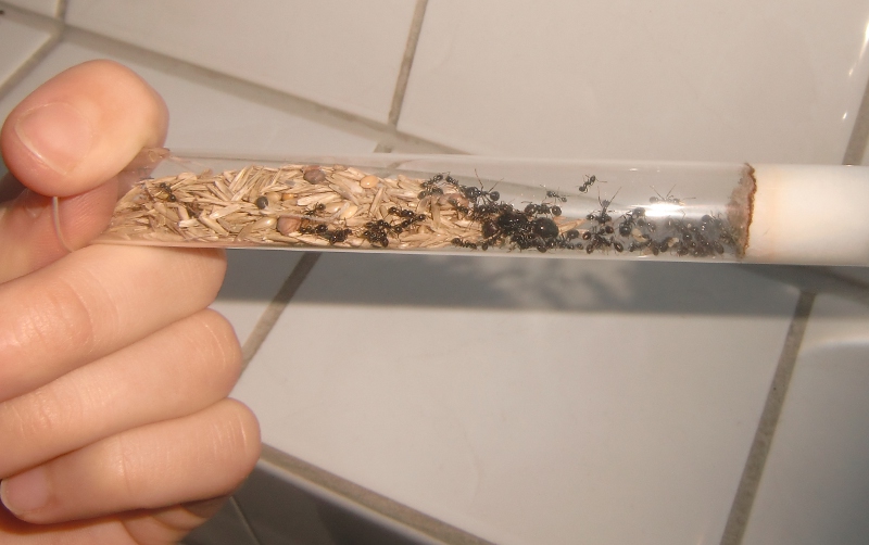 Wie schon im letzten Bericht angedeutet hatte die Königin Probleme den oberen Bereich des Nestes zu erreichen, was wahrscheinlich auf den Fehler meinerseits zurückzuführen ist, den Verbindungsgang senkrecht anzulegen. Die Folge war, dass die Königin allein in der unteren Kammer saß, während der Rest der Kolonie sich im oberen Teil aufhielt. Oft versuchte die Gyne, ebenfalls nach oben zu gelange, stürzte aber immer wieder ab. Nachdem ich dies einige Zeit beobachtet habe, lies ich die Kolonie zurück in ein Reagenzglas ziehen. Dieses unterscheidet sich weniger in der Größe als darin, dass alles komplett ebenerdig ist. Im nachhinein tut mir das hin und her sehr Leid, ich hoffe, dass die Kolonie nun erst mal in Ruhe wachsen kann.