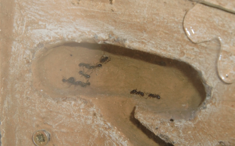 Auch ein Verhalten, welches schon von anderen Haltern beobachtet werden konnte, trat bei meinen M. Barbarus auf. Zu einer Zeit, in der es im Nest offenbar zu trocken war, verließ die Königin selbst das Nest, um die Tränke aufzusuchen. Ich frage mich, warum die Arbeiterinnen nicht, wie bei anderen Arten auch, das Wasser an die Königin weitergeben können. Schließlich ist das Verlassen des Nestes doch sehr riskant, da helfen die paar Arbeiterinnen, die ihr Geleit gaben, auch nicht viel.