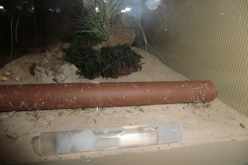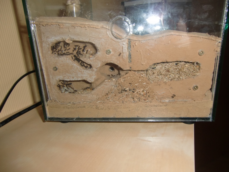 Mittlerweile wohnt M. ebeninus in einem neuen Ytong-nest, welches sehr viel praktischer für sie ist und über eine trockene Kornkammer verfügt, die bis zum Rand gefüllt ist. Siehe dazu die Bilder. Beide Becken wurden mit getrocknetem Moos und Gräsern verschönert. Sie wirken nun weniger kahl.