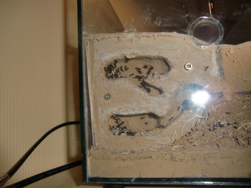 Ich habe bereits ein neues Nest mit verbessertem Kammersystem konstruiert, noch dient dieses nur der Dekoration und Arenaeinrichtung, dennoch sind häufig Arbeiterinnen darin unterwegs. Einen Umzug werde ich jedoch nicht in die Wege leiten. Interessant zu beobachten ist, wie die Kolonie jegliche Spalten zwischen Glas und Ytongblock mit kleinen Sand-Lehm Krümeln zubaut, selbst im neuen Nest selbst.