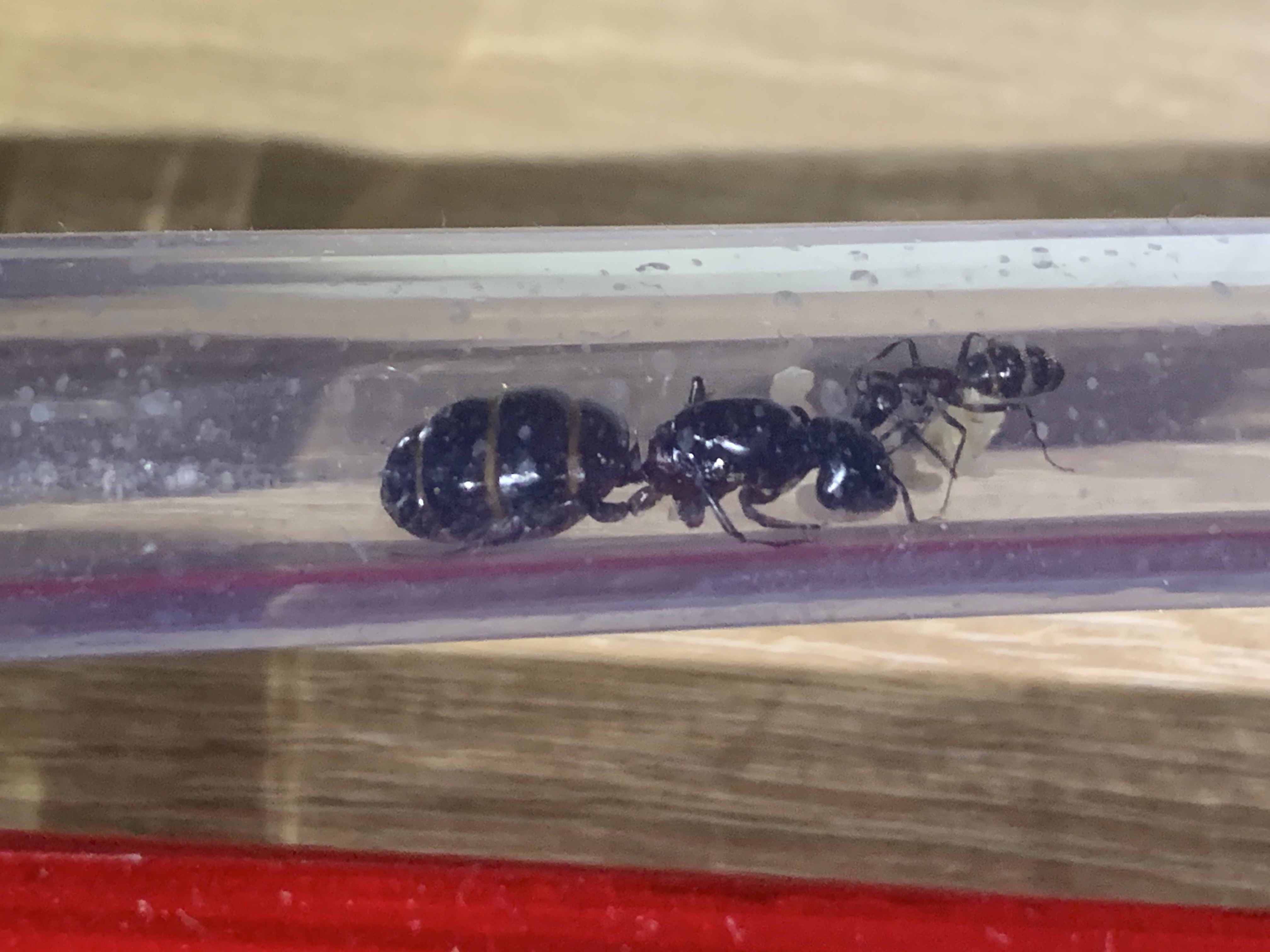 Die Ameisen sind seit 2 Tagen im Nest, ganz von alleine ins warme feuchte Nest umgezogen. Offenbar fühlen sie sich wohl.