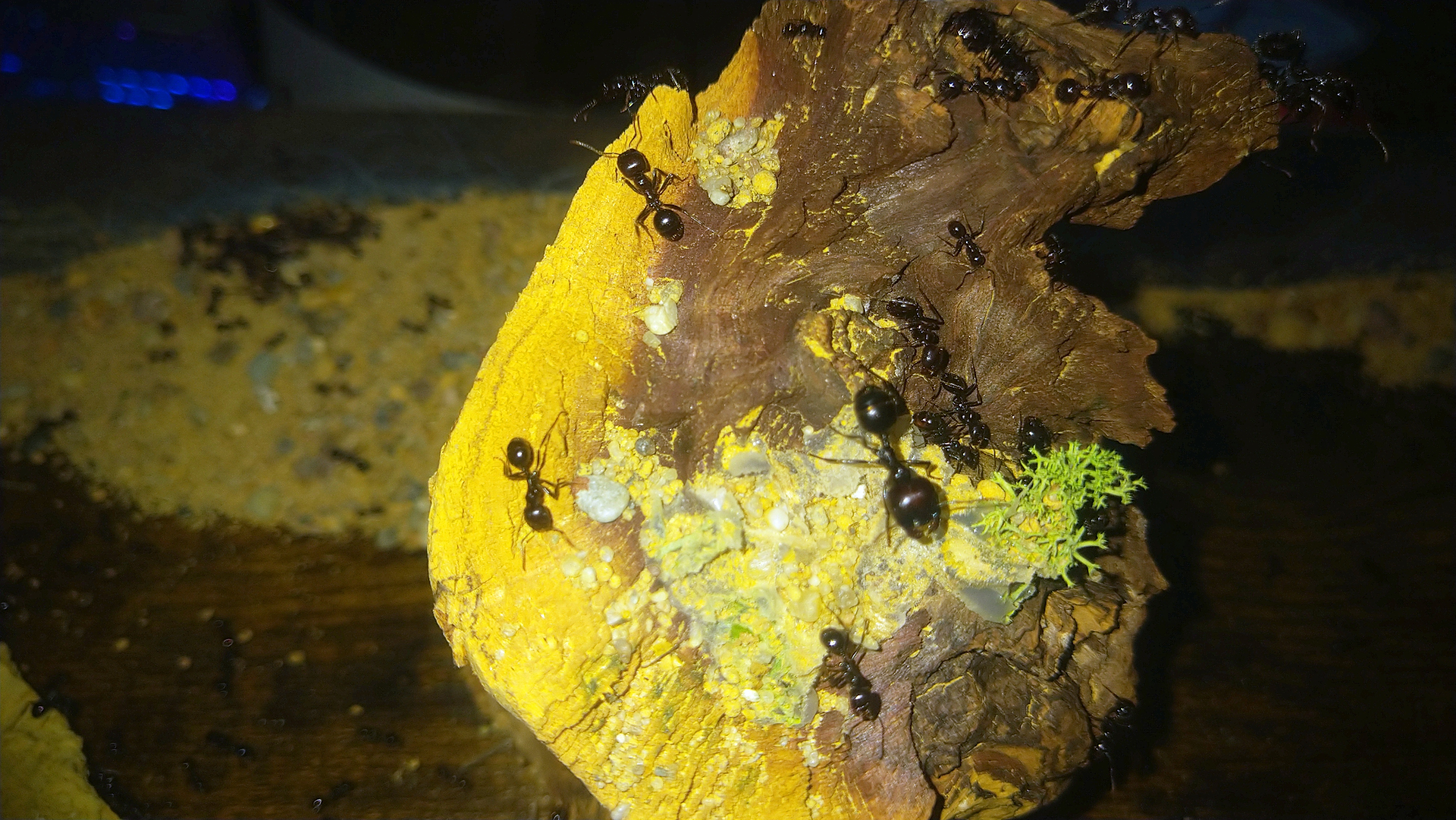 Wann eins der Nester mal wieder befeuchtet werden muss, ist super easy an den Arbeitern abzulesen. Sind die Wasserspender zugetackert mit Ameisen, brauchen sie mehr Feuchtigkeit im Nest. Nach befeuchtung dauert es 1-2 Tage und der Andrang am Wasserspender ist halbiert. DafĂĽr wandert dan was