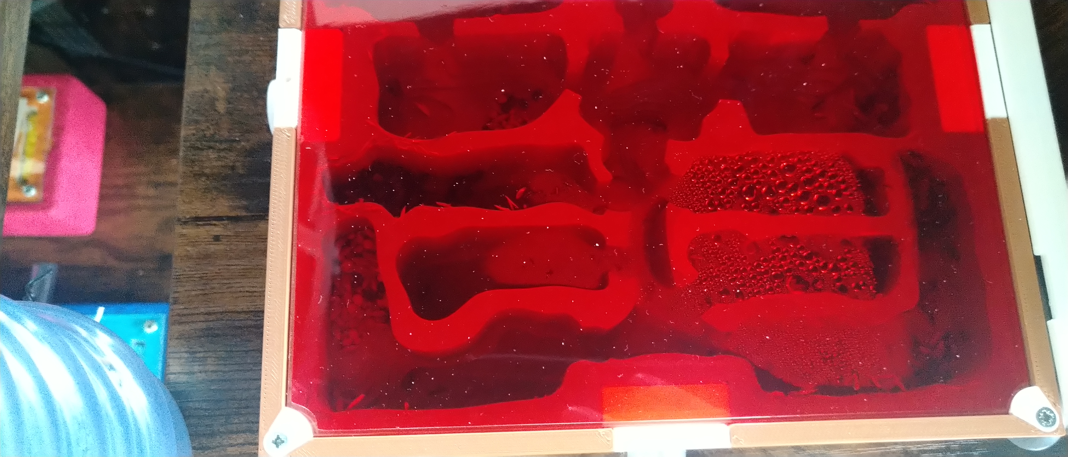 Umzug beendet. Konnte das kleine Nest heute morgen abstecken. War komplett leer. Aktuell wird der Feuchte Bereich klar bevorzugt. Ist in meinen Augen aber zu feucht geworden. Muss mich da erst wieder reinfinden. Den Deckel lass ich jetzt weg, die Rote Folie scheint zu reichen.