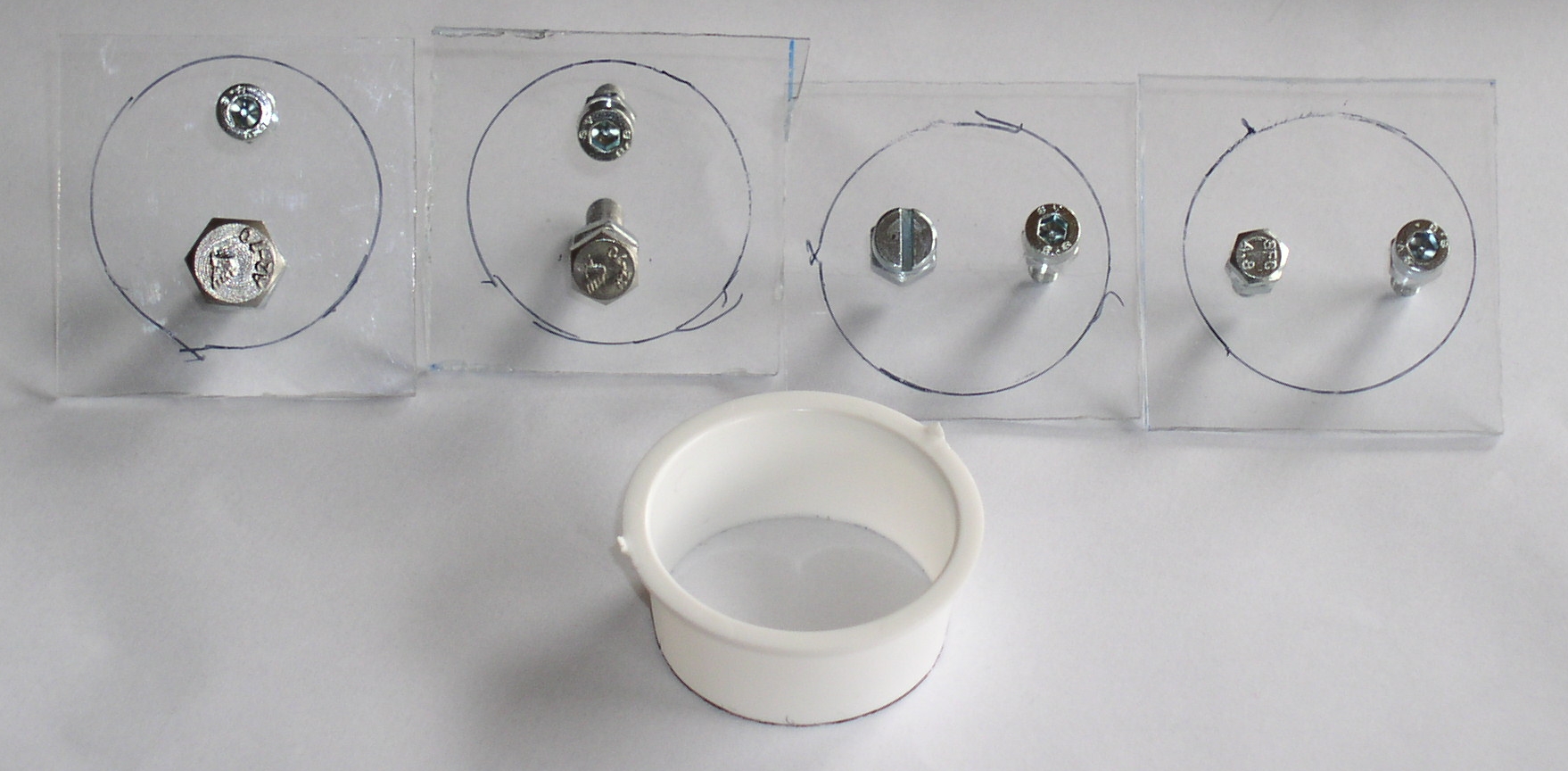 Die beiden kleineren Schrauben von meinen vier Vorlagen haben einen Durchmesser von ungefähr 1cm, eine davon geteilt, um zwei Kammern zu simulieren.