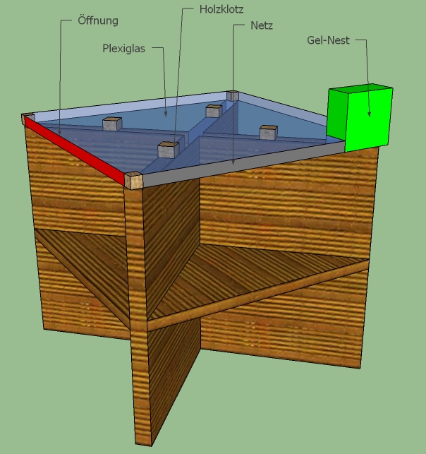 Plexiglas; wird durch Holzklötze auseinandergehalten; "Wände" bestehen aus einem sehr feinen Gitter (Löcher 0,2mm)