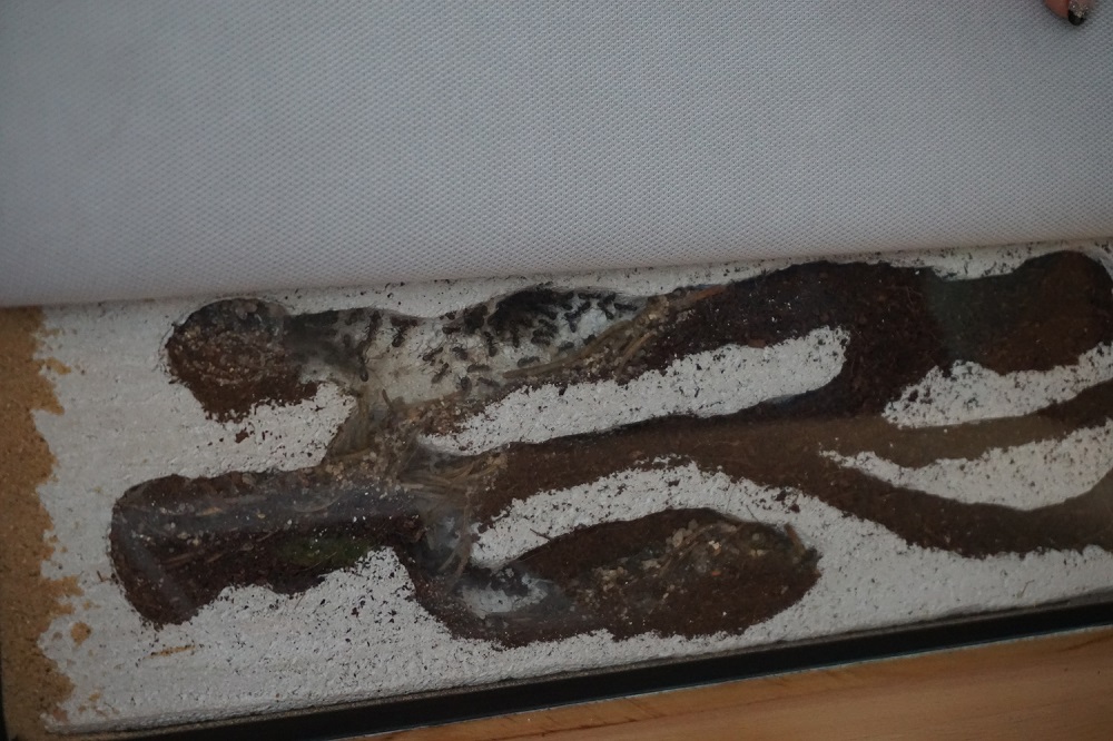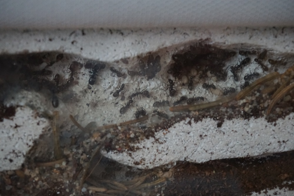 Jetzt bin ich aus dem Urlaub wieder da, und musste feststellen, dass sie ein Loch unter der Scheibe, auf der das Nest stand, gegraben haben, in das sie verschwunden sind, obwohl nicht alle reinpassten (das Sand-Lehmgemisch ist bei der Bewässerung des Nestes an der Stelle wohl ab und zu nass geworden).
