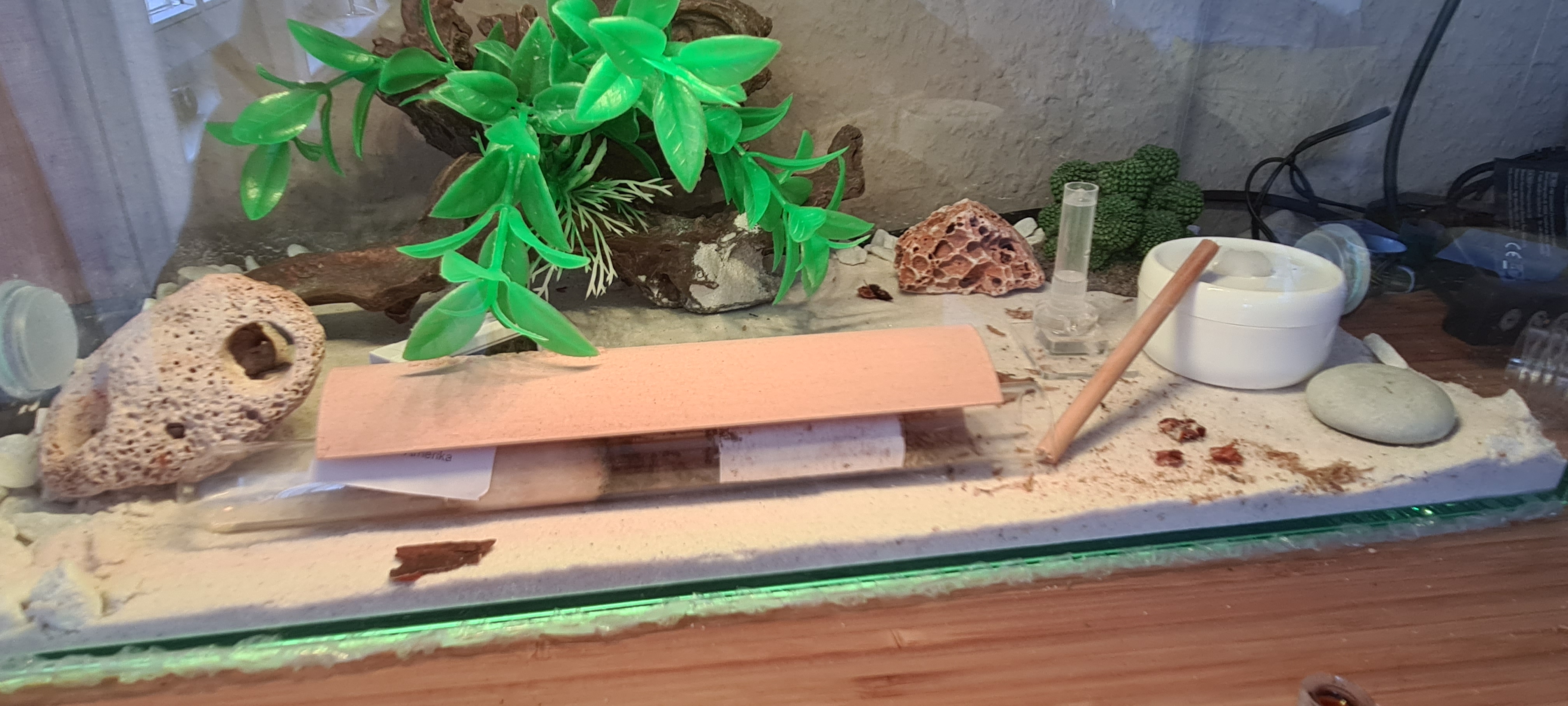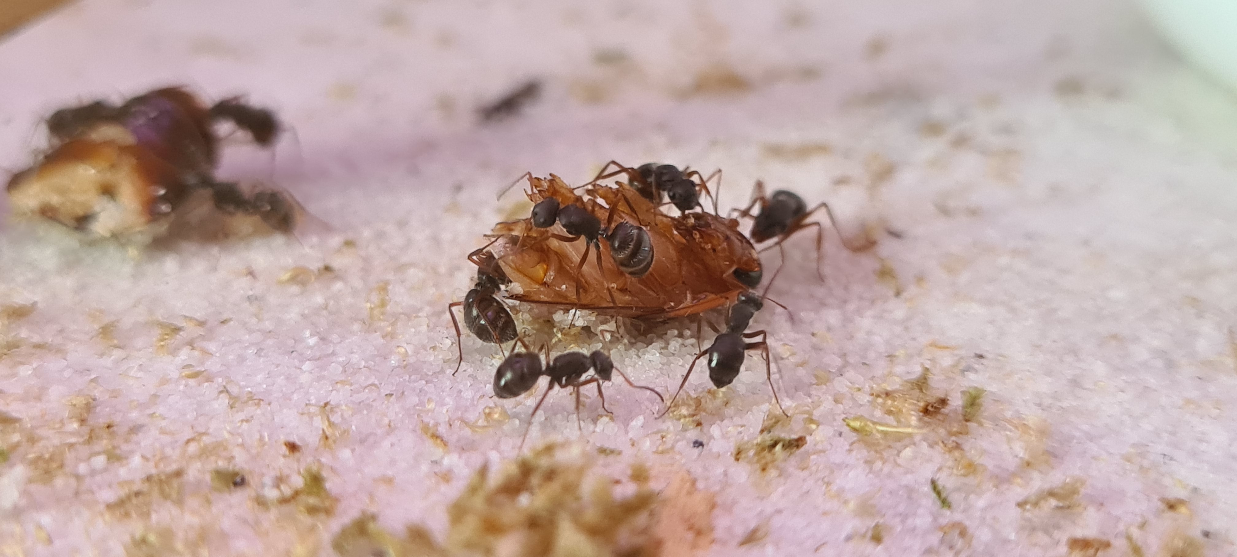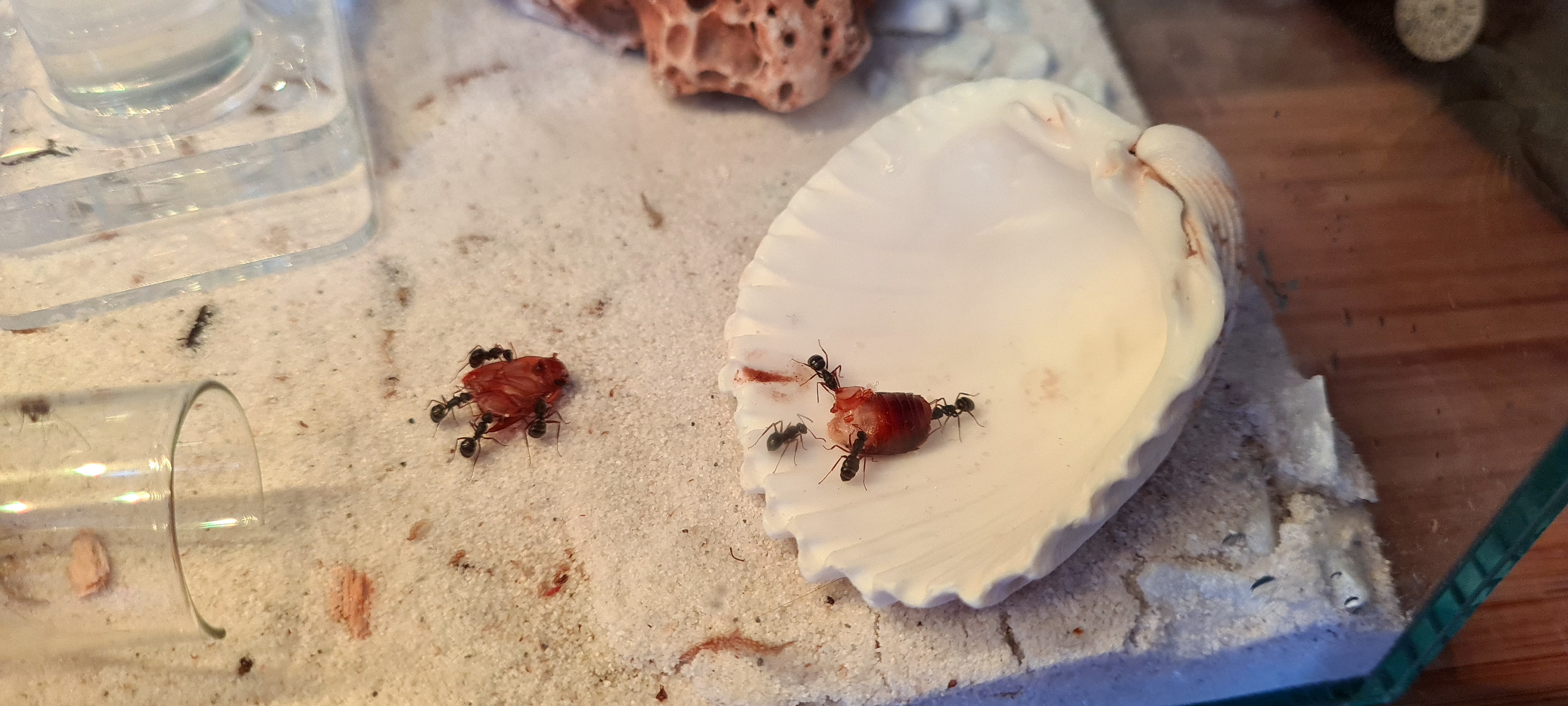 Es ist jetztaif jedenfall viel viel mehr AktivitÀt im Formicarium. Gestern waren dann doch noch 3 Arbeiterinnen an der Schockoschabe zu gange. Konnte auch beobachten wie eine nach der anderen aus dem Nest zur TrÀnke ging und sich die