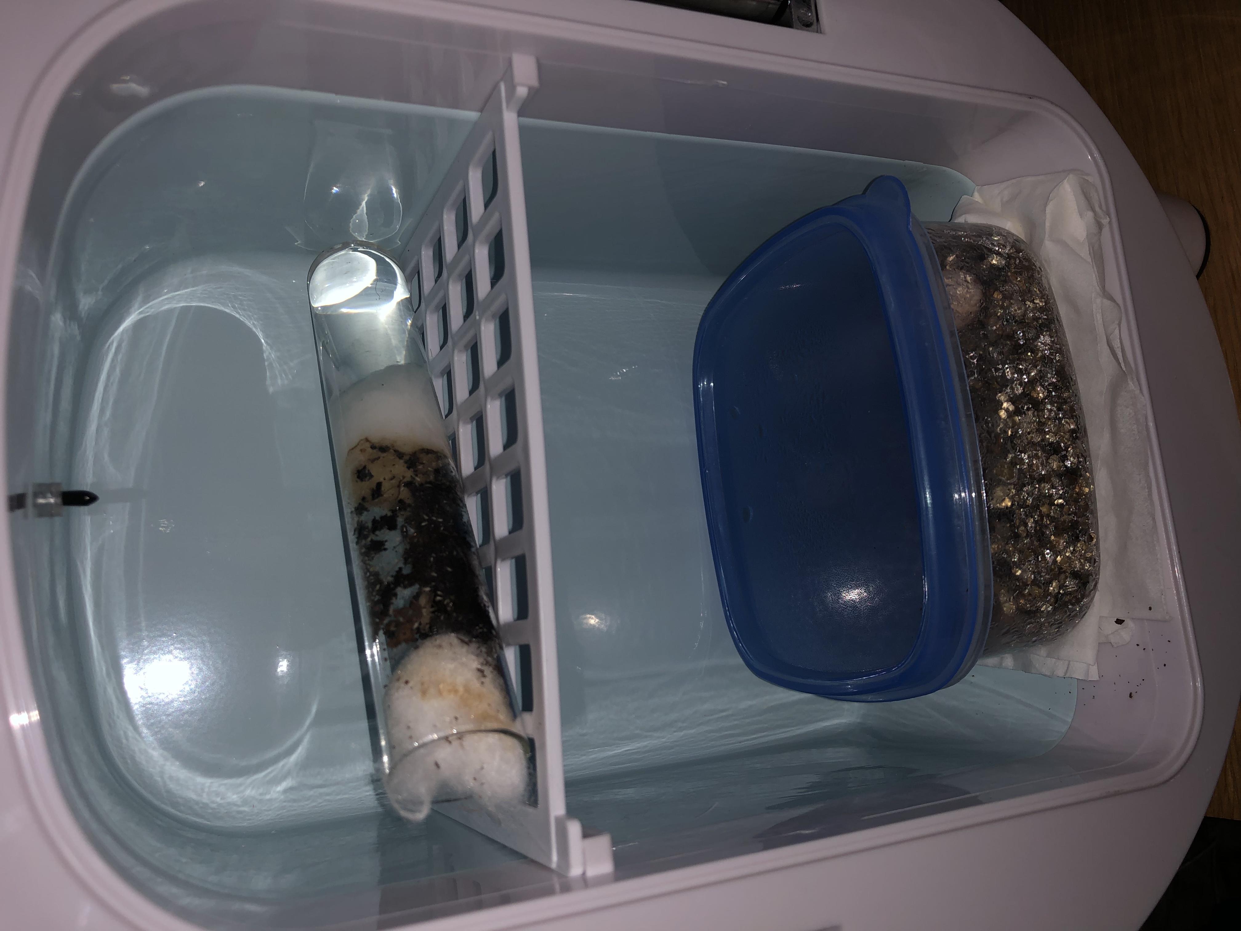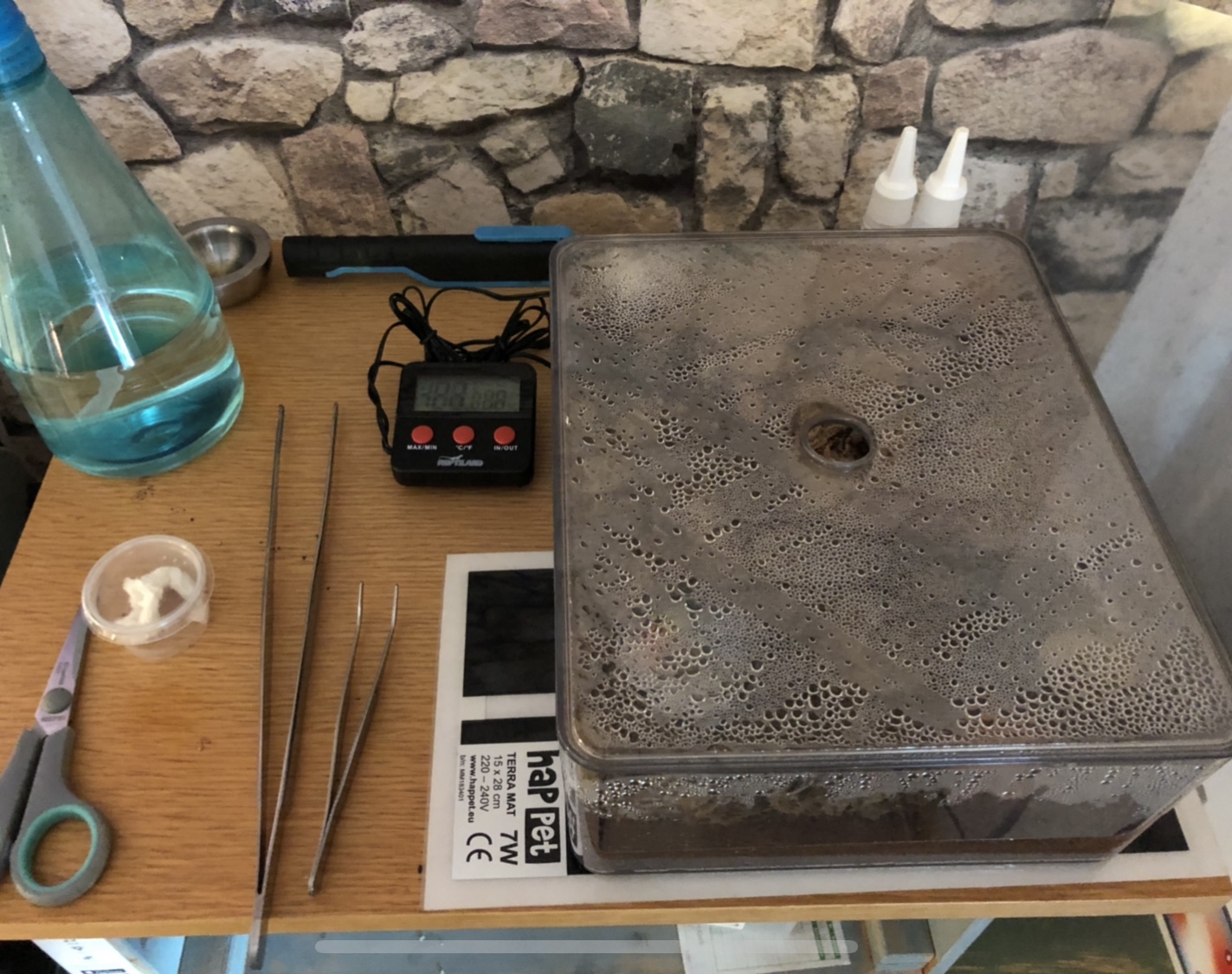 Zunächst stellte ich die Box komplett auf die Heizmatte. Nach ein paar Stunden überprüfte ich die Temperatur und die Feuchtigkeit.