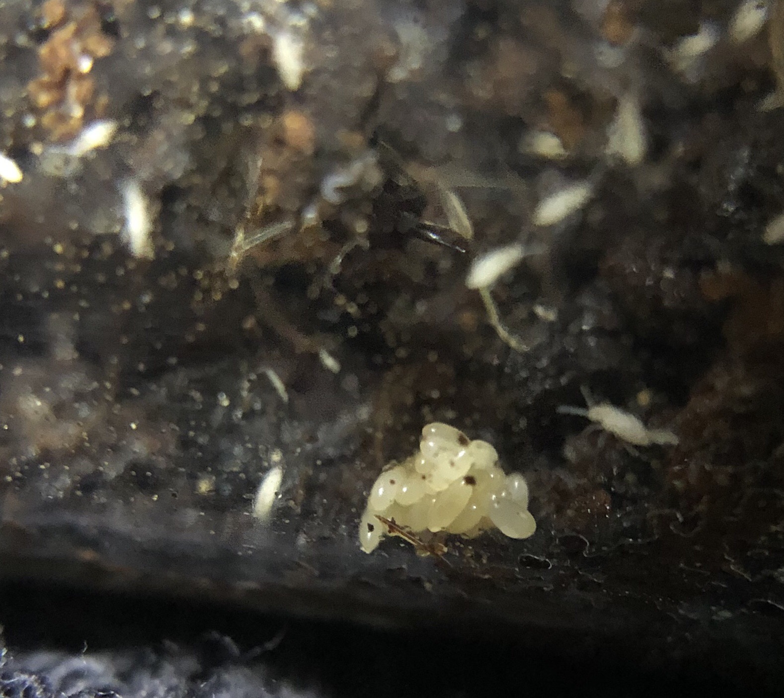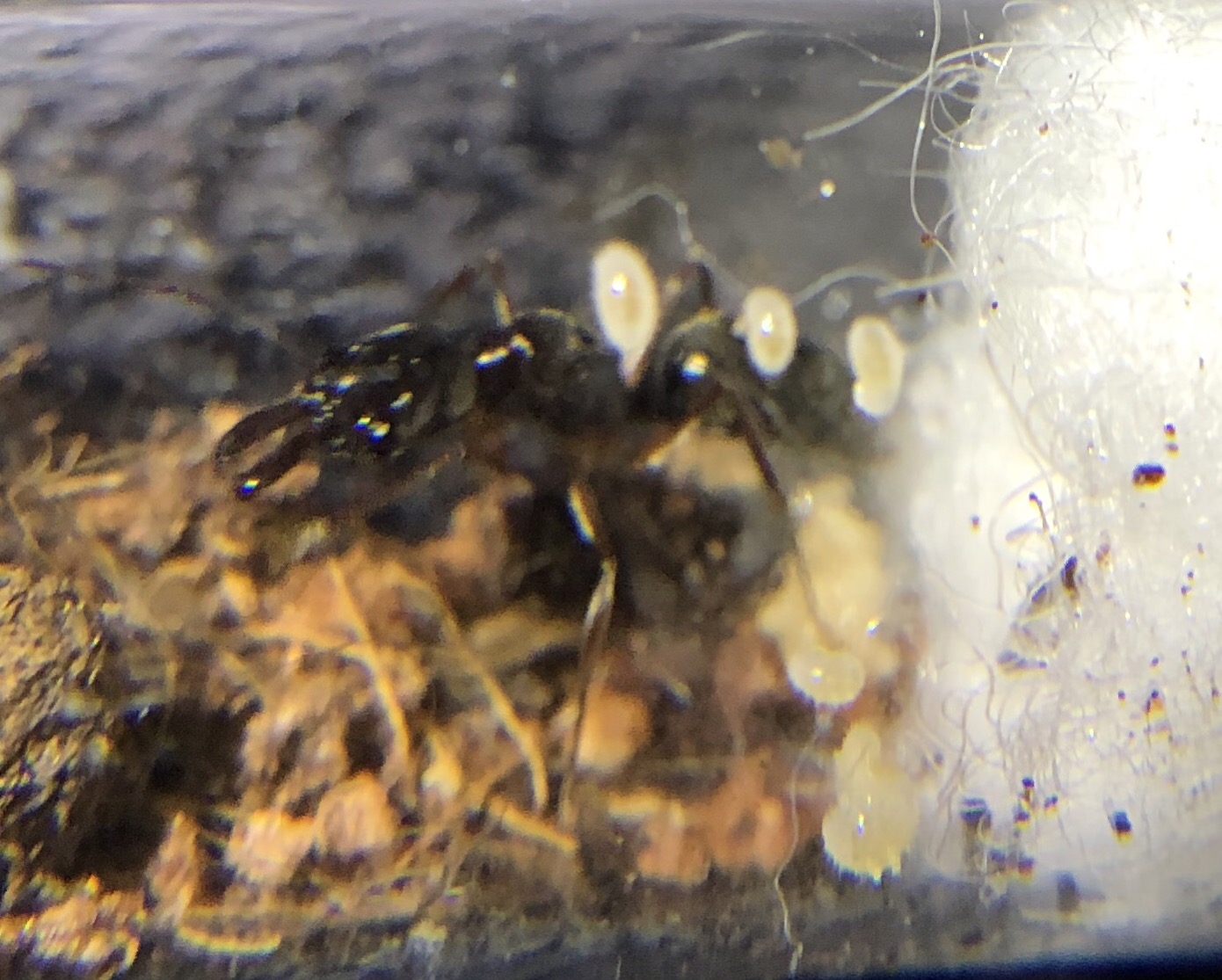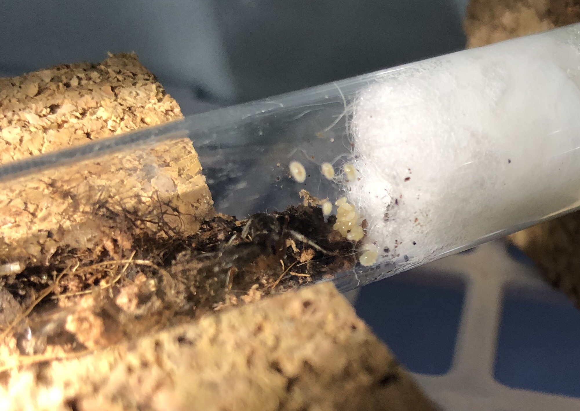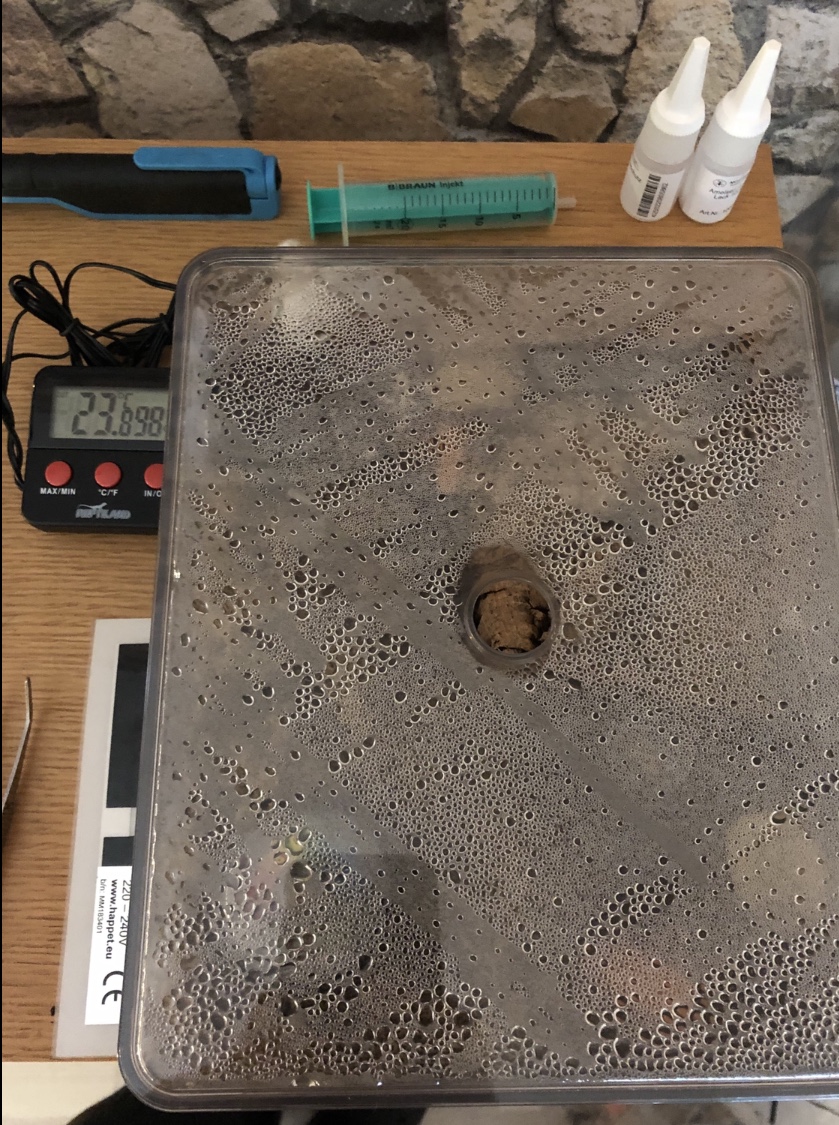 Die Gyne hatte sich in der Box in die kühlste Ecke verzogen (wahrscheinlich weil die Springschwänze auch bevorzugt im warmen Bereich sitzen), in dem Reagenzglas im Inkubator konnte ich beobachten das sie die Brut ständig umlagerte und zuletzt sogar ganz nah am Eingang des RG‘s mit ihren Eiern saß. Ich vermute das sie letztendlich wirklich zu sehr durch das „Große Krabbeln“ der Springschwänze und den Asseln gestört wurde und deshalb immer wieder ihre Brut gefressen hat.