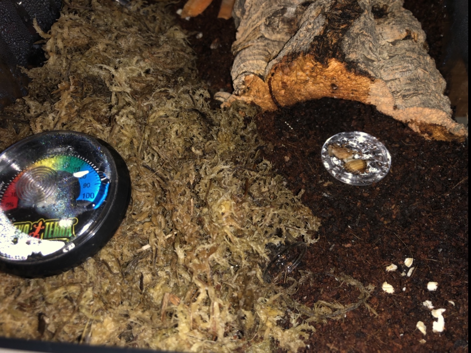 Die Box habe ich etwa zur Hälfte mit feuchtem Humus gefüllt, die Korkrinde und das RG platziert, und die Ecke mit dem RG mit Sphagnum Moos ausgepolstert. Somit war das RG auch gleich abgedunkelt.