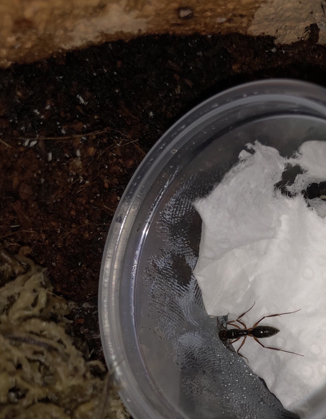 Die Gyne trägt weiterhin Futter ein und sitzt nun mit ihrer gesamten Brut nah an der feuchten Watte.