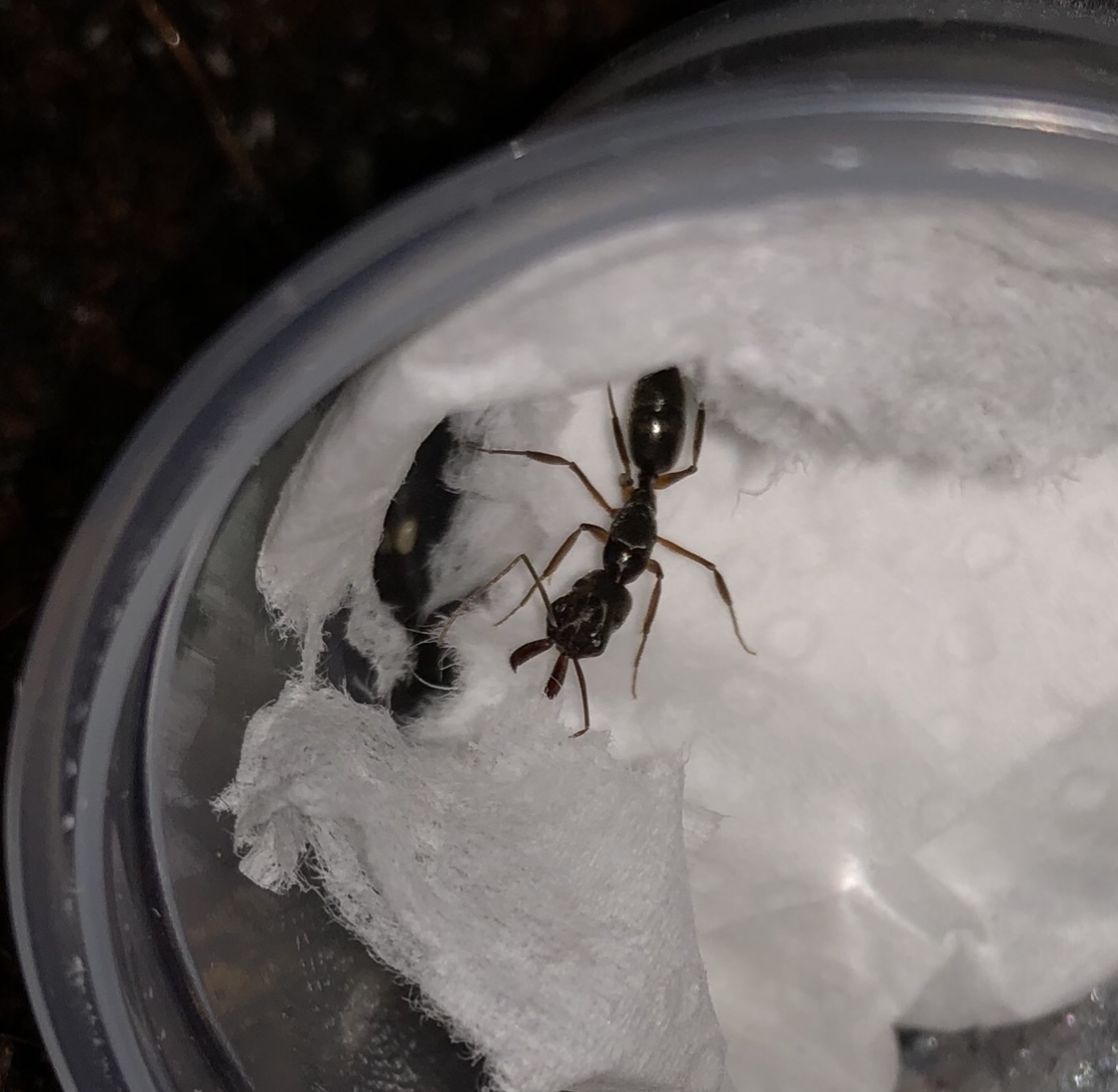 Eine wunderschöne, etwa 10-11 mm große Odontomachus Königin in einer kleinen Kunststoffdose, versendet mit Heatpack und feuchtem Küchenpapier.