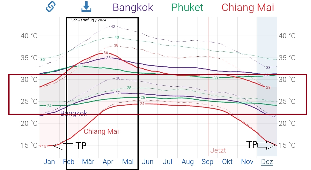 Laut Statistik liegt der Tiefpunkt im Dez/Jan bei 15 Grad Celsius (Chiang Mai).