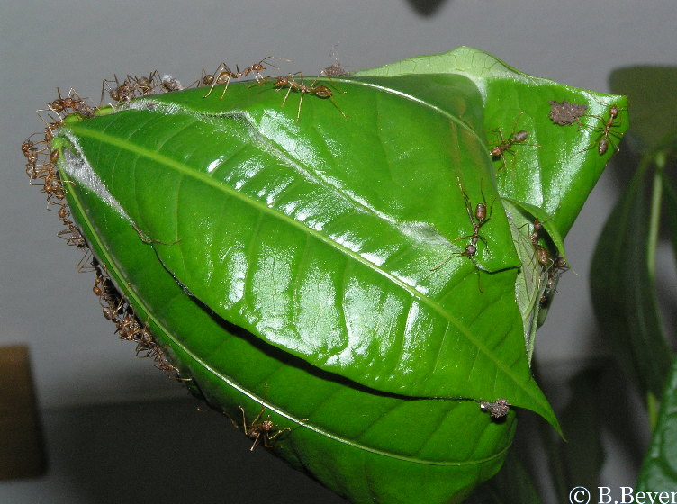 Mit beeindruckender Geschwindigkeit ging es vorwärts, einzelne Blätter waren bereits nach einigen Stunden zusammengebracht und so rückten die ersten Arbeiterinnen-Kolonnen mit Larven an. Ein nächster erstaunlicher Punkt bei dieser Art: Normalerweise würden sich die Larven in einen Kokon einwickeln, in dem sie die Metamorphose zum adulten Insekt vollziehen. Bei den Weberameisen spielt dieses Entwicklungsstadium jedoch eine entscheidende Rolle beim Nestbau. Sie spenden den "Klebstoff", um die Blätter ihrer zukünftigen Behausung zu verbinden. Die Larven werden zwischen den Mandibeln gehalten und mit den Antennen betrillert, welches sie veranlasst ihr seidiges Sekret abzugeben. Mit seitlichen Bewegungen zwischen den Blatträndern hin und her wird das Nest nun verwoben und erhält seine Stabilität. Doch in der Natur geschieht nichts aus reiner Selbstlosigkeit, denn in diesem Nest werden auch die Larven einen Platz finden, der ihnen Sicherheit bietet und wo sie versorgt werden.
