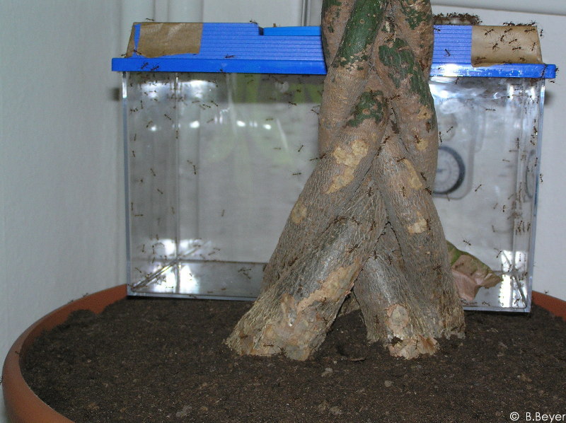 ...den Behälter mit Schraubverschluss stellte ich auf den Blumentopf. Mein Freund öffnete den Deckel und ersichtlich aufgeregt kamen ihm gleich einige Ameisen entgegen. Es dauerte eine Weile bis sich die ersten Arbeiterinnen herauswagten, um ihr neues Zuhause zu begutachten. Dies taten sie dann aber sehr genau: Es erweckte fast den Anschein als würden sie eine innere Landkarte der Pflanze erstellen, indem Zentimeter für Zentimeter abgelaufen wurde. Nach etwa zwei Tagen nahmen wir das alte Nest aus dem Behälter, heftig wurde die Pinzette attackiert, greifte sie doch in das heilige Revier der Ameisen ein, der Wohnort der königlichen Hoheit.