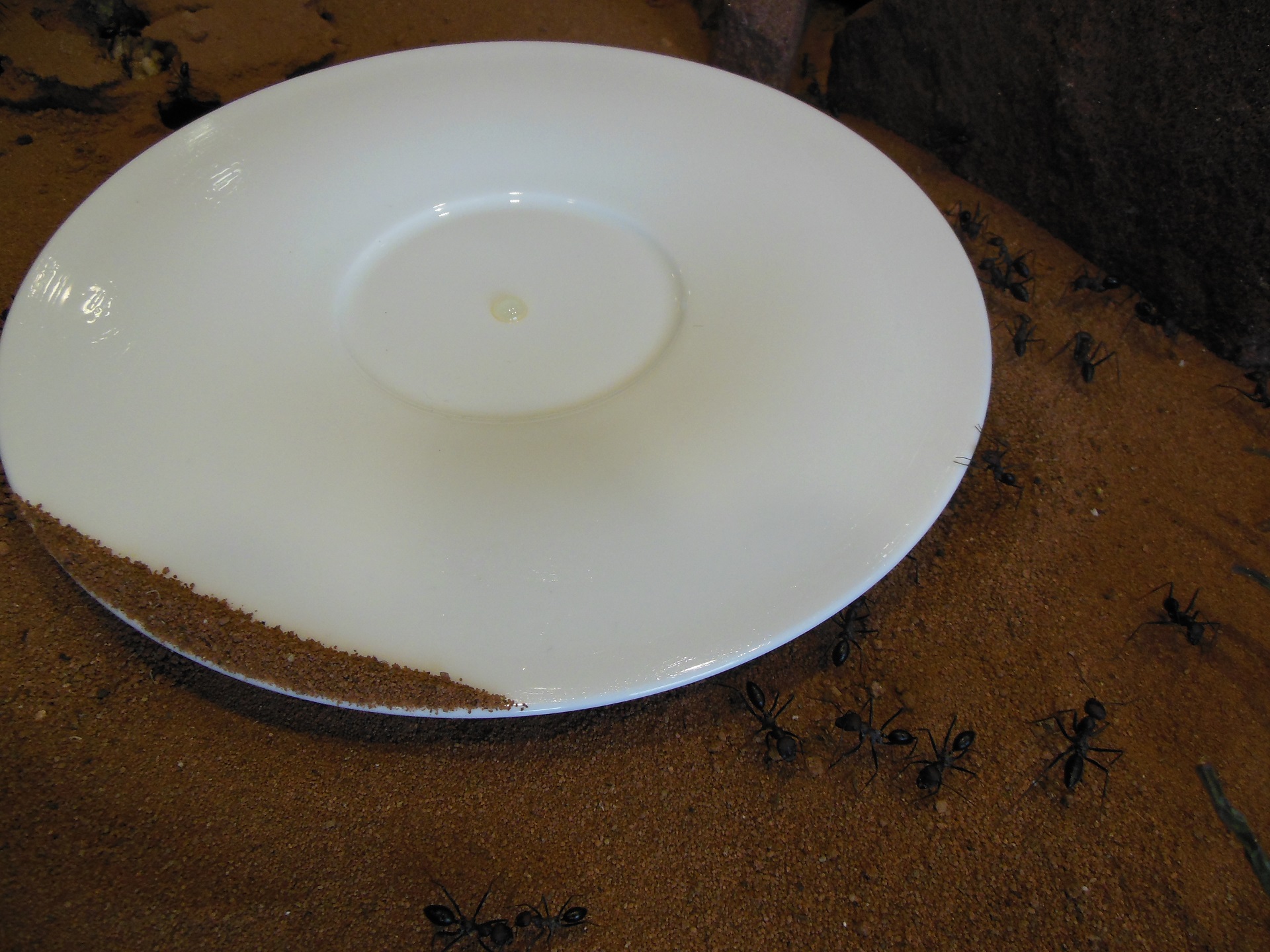 Ich habe in der Zwischenzeit auch mal eigene Versuche zu Paraffinöl gemacht. Getestet wurde es allerdings nur mit Cataglyphis oasium. Dabei habe ich einen Teller genommen und waagerecht mit Öl eingeschmiert. In der Mitte habe ich Honig angeboten und beobachtet. Die Ameisen betasten tatsächlich den Film und werden davon abgeschreckt und sammeln sich um den Teller herum. Immer wenn die Ameise mit den Fühlern das Öl berührt, kehrt sie um.
