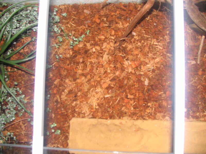 Als erstes hab ich den Stein, bündig an die Scheibe des Nestes gestellt. Dann hab ich angefangen mit den Styroporplatten eine grobe Form für die Landschaft zu schnitzen. Nach den ersten 2 Schnitten merkte ich schon, das ich mir das Falsche Material ausgesucht hatte. Das Styropor flog nur so durch die Wohnung und verursachte eine Menge Dreck (Nächstes mal nehme ich Styrodur). Nachdem ich die Landschaft fertig hatte, und alles passend in das Becken eingesetzt hatte, hab ich eine grobe Schicht Seramis eingestreut an Stellen, die ich besonders mit Feuchtigkeit versorgen wollte. Ob das nun notwendig war, weiß ich nicht. Das linke fünftel des Beckens habe ich frei gelassen um dort diverse Blumen einzupflanzen. Dann hab ich über die komplette Landschaft eine Schicht Gips gezogen. Was auch keine dreckfreie Angelegenheit war ^^ nachdem der Gips ausgehärtet war, hab ich ihn, genau wie das Nest mit Lehm angepinselt. Darüber verteilte ich die Schicht mit Terrariensnd. Darüber den Humus aus dem geressten Ziegel.