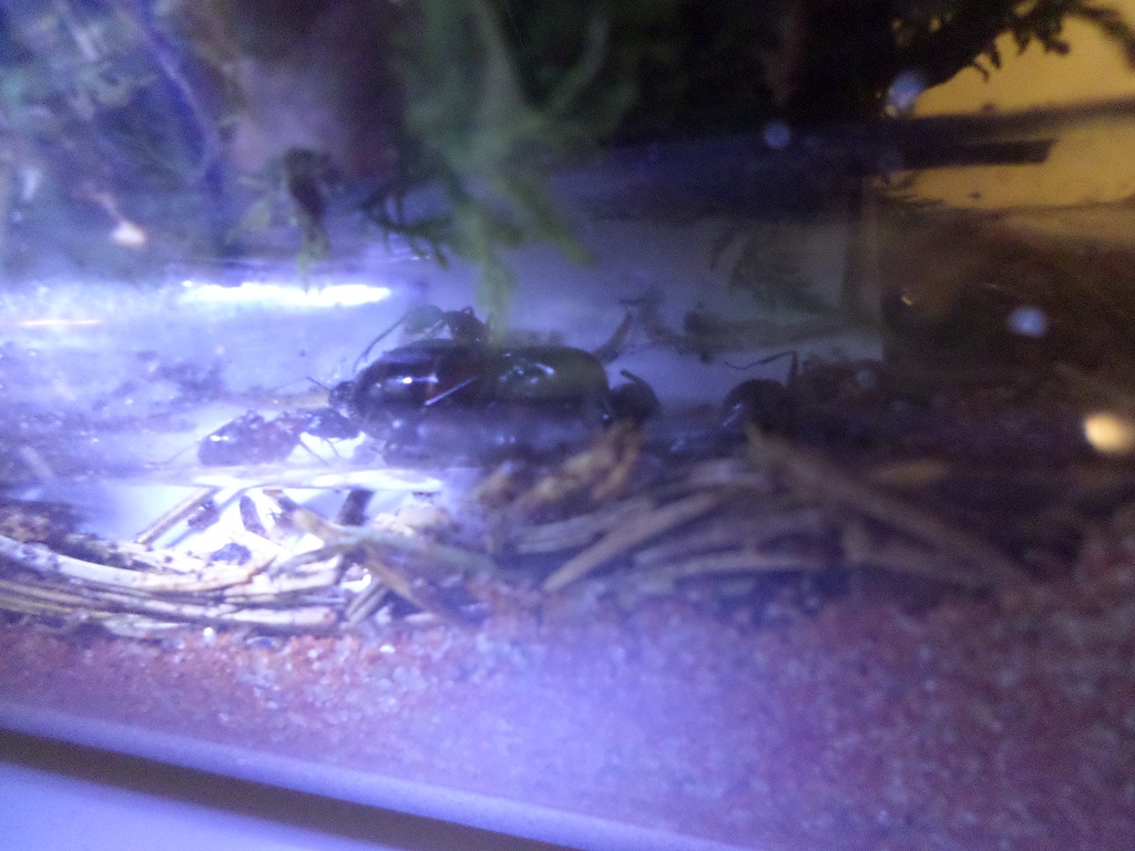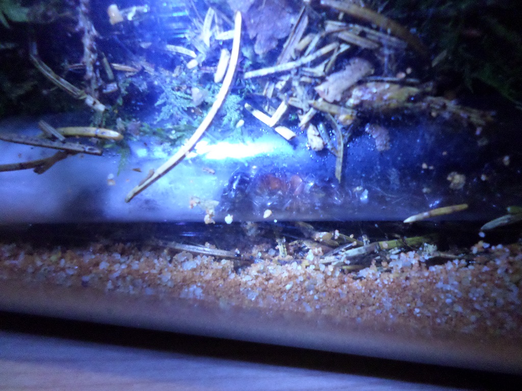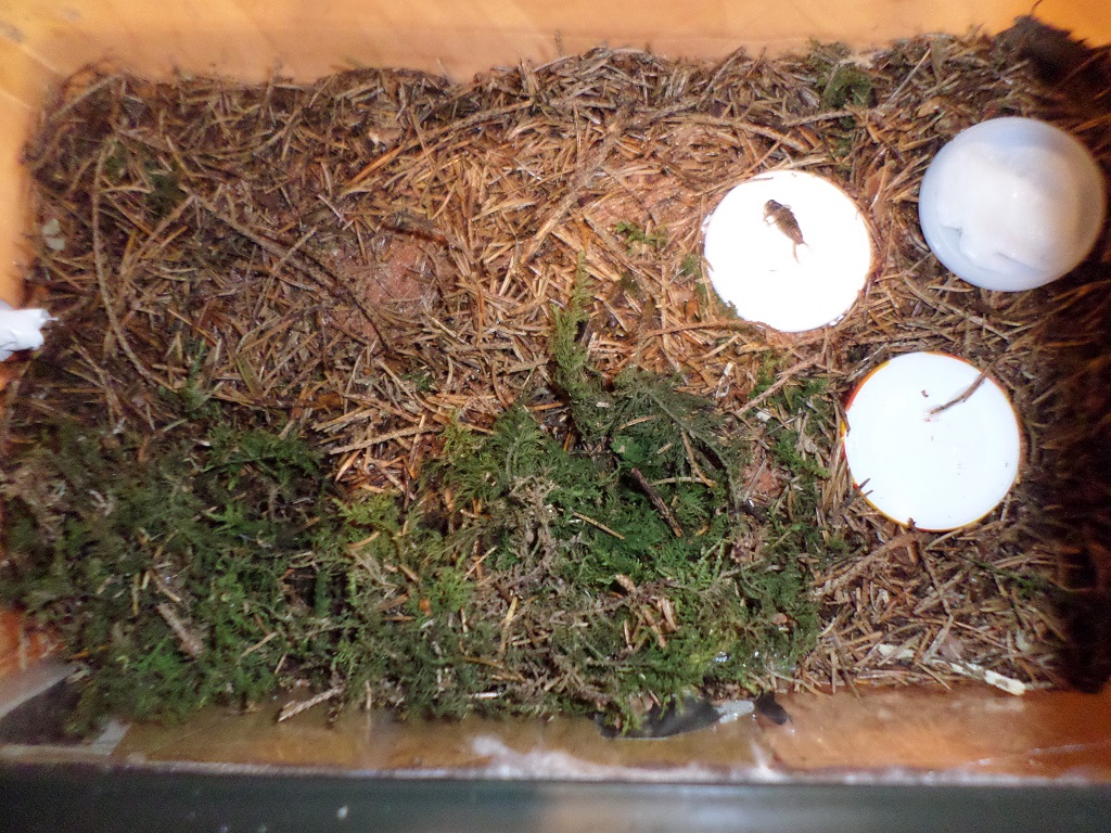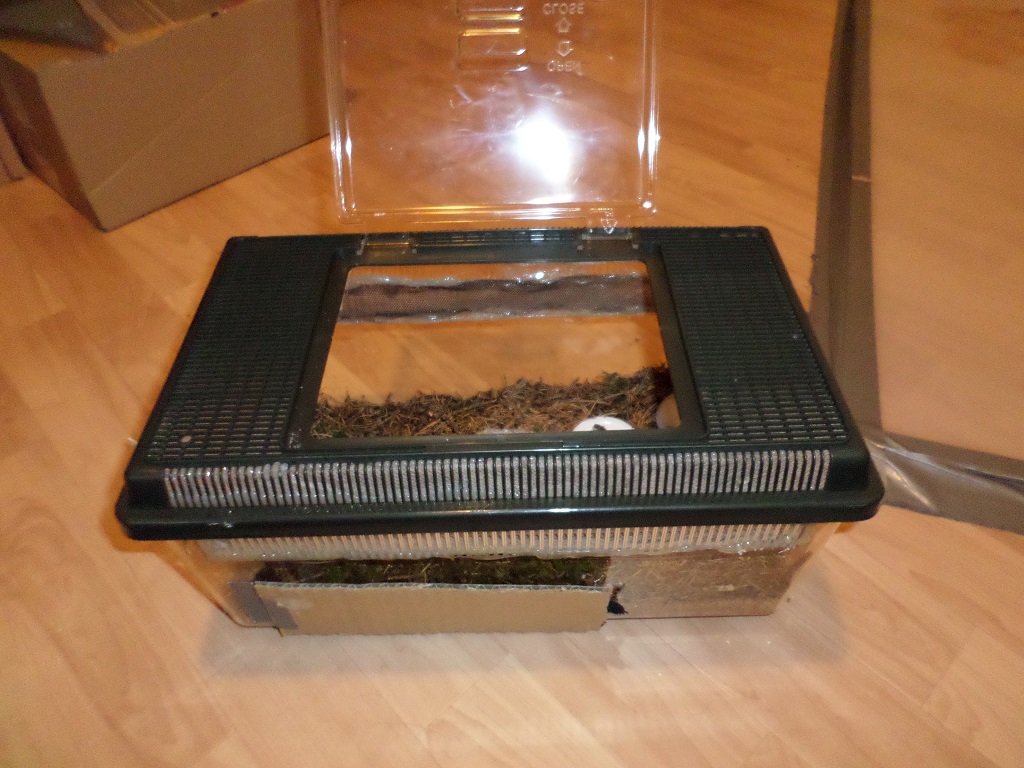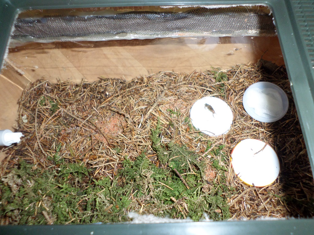 Ich hab mich fĂŒr den direkten Anfang fĂŒr eine Arena/Nest Kombi entschieden. Das ganze besteht aus einem Plastikfaunarium fĂŒr Reptilien mit einem nĂŒtzlichen Klappdeckel. Der Deckel liegt so in einer Fuge das man von Innen nicht darunter bzw. Zwischen Deckel und Rahmen krabbeln kann. Die unzĂ€hligen Luftgitter hab ich mit doppeltem Insektenschutzgitter abgedeckt und alles großzĂŒgig mit heißkleber angeklebt. So, der Bodengrund besteht aus einer 2 cm starken trockenen Sandschicht und darĂŒber eine 3 cm dicke Schicht aus tannen/fichten nadeln , Moos und allem was ich so am Waldboden finden konnte.