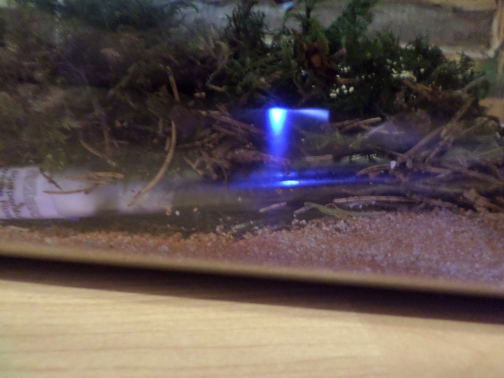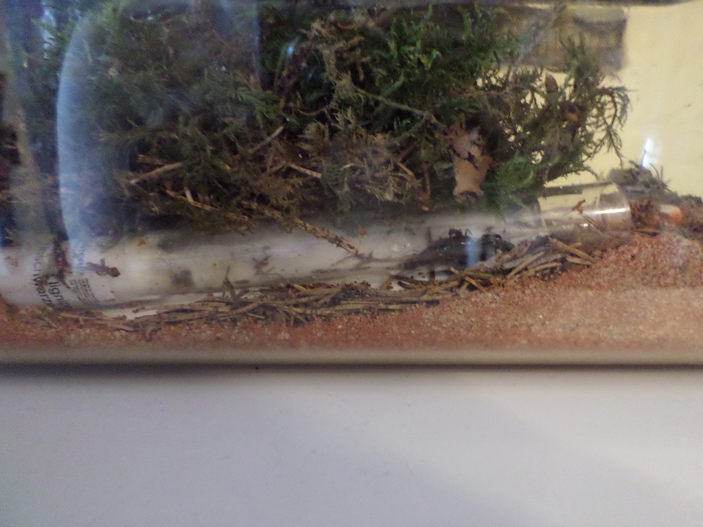 Der Eingang ist nun komplett mit Nadeln vollgestopft, meine Konstruktion weist jetzt schon einen großen Fehler auf. Dadurch das das RG unter dem Moos verdeckt wird ist es gewissermaßen Zappenduster darin. Durch die Scheibe die auch noch etwas verschmiert ist erkennt man nur undeutlich das ganze Nest.