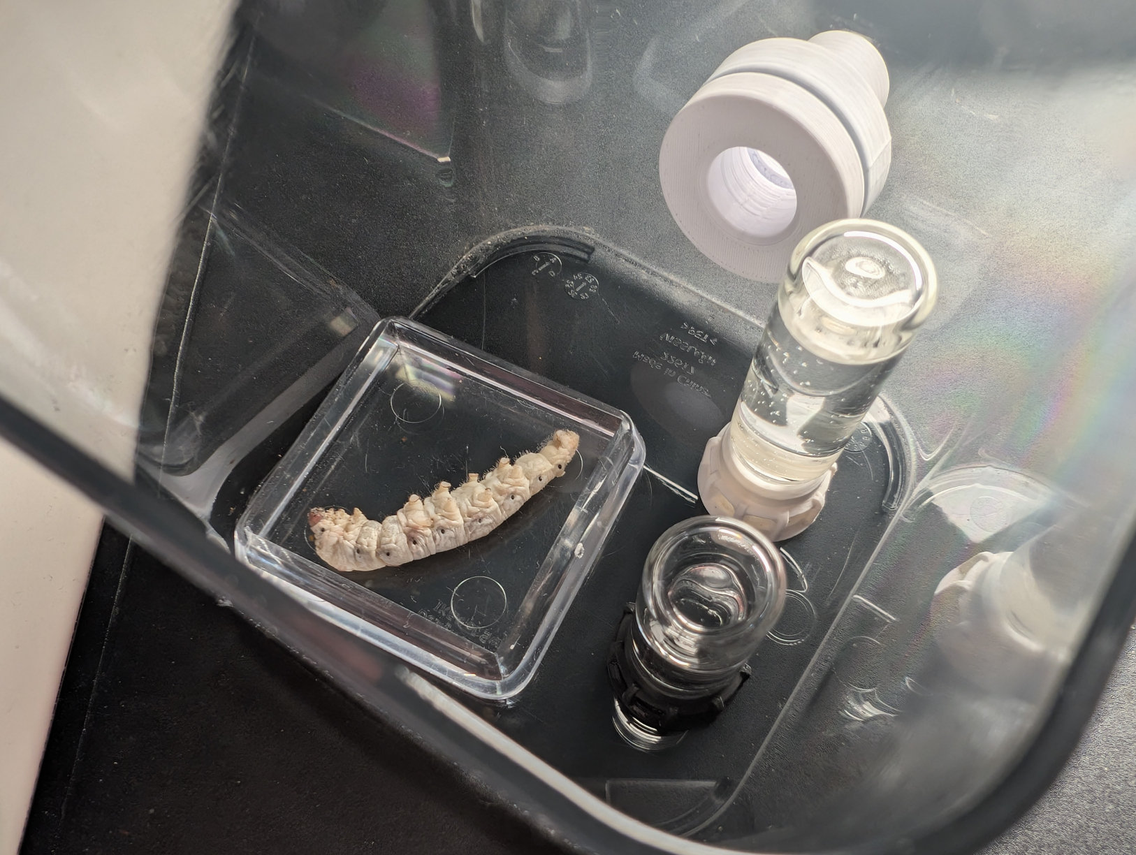 Die Aufmerksamen werden eine weiĂe Raupe in der Arena entdeckt haben. Dabei handelt es sich um Bombyx mori oder auch bekannt als Seidenraupe/-spinner, einem anderen Projekt der vergangenen Wochen. Von Ei bis aktuell Kokon habe ich diese selbst aufgezogen als mögliches Futtertier. Die Erfahrungen sind dabei sehr positiv und den ersten Reproduktionszyklus dĂŒrfte ich noch dieses Jahr abschlieĂen.