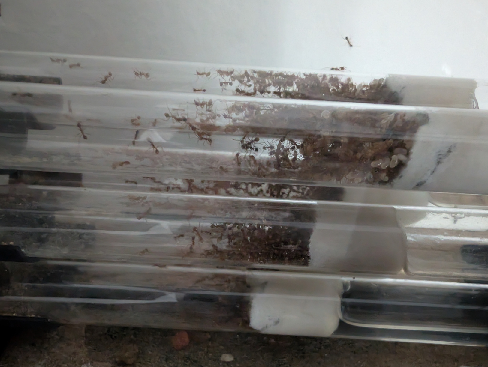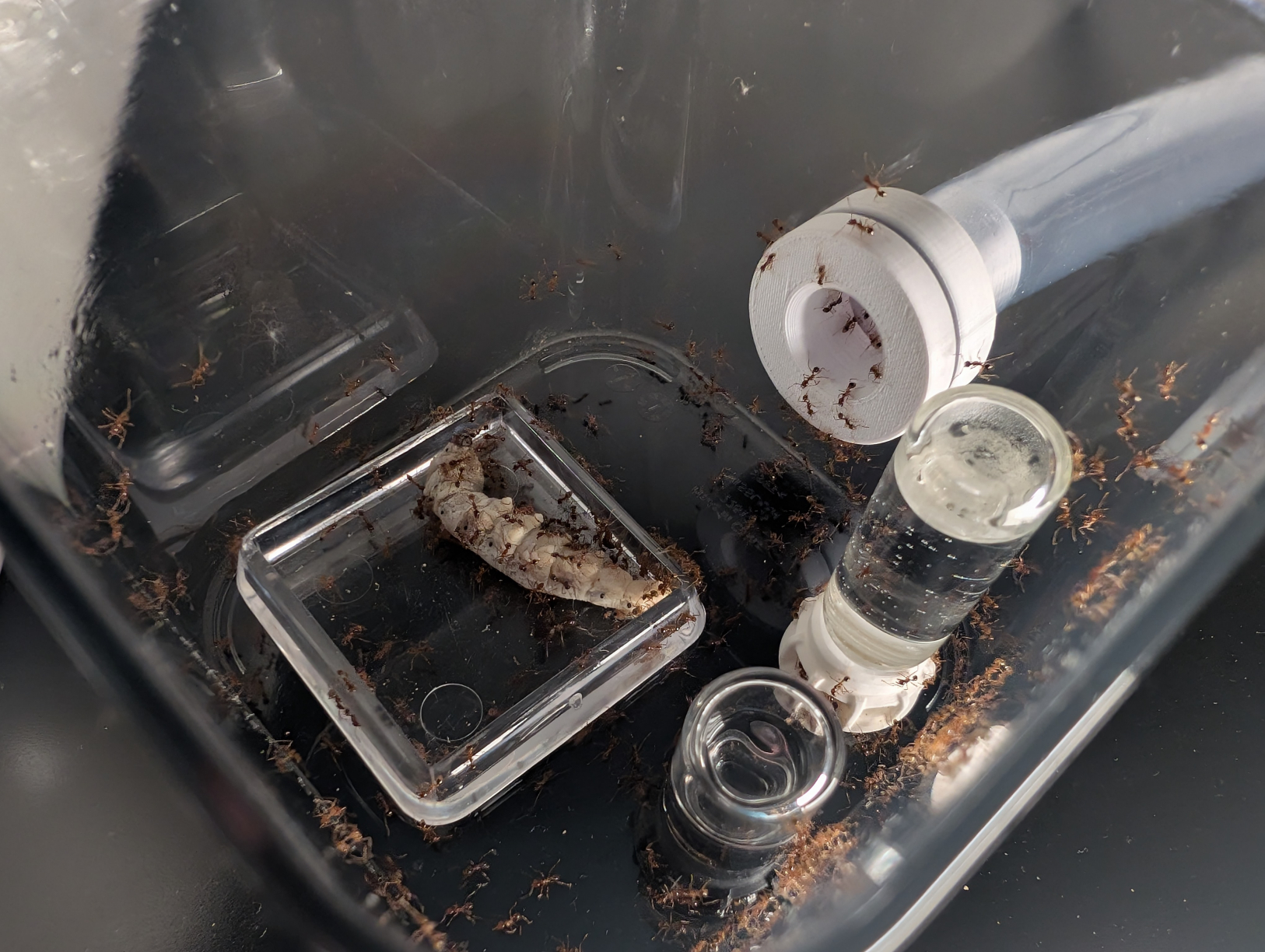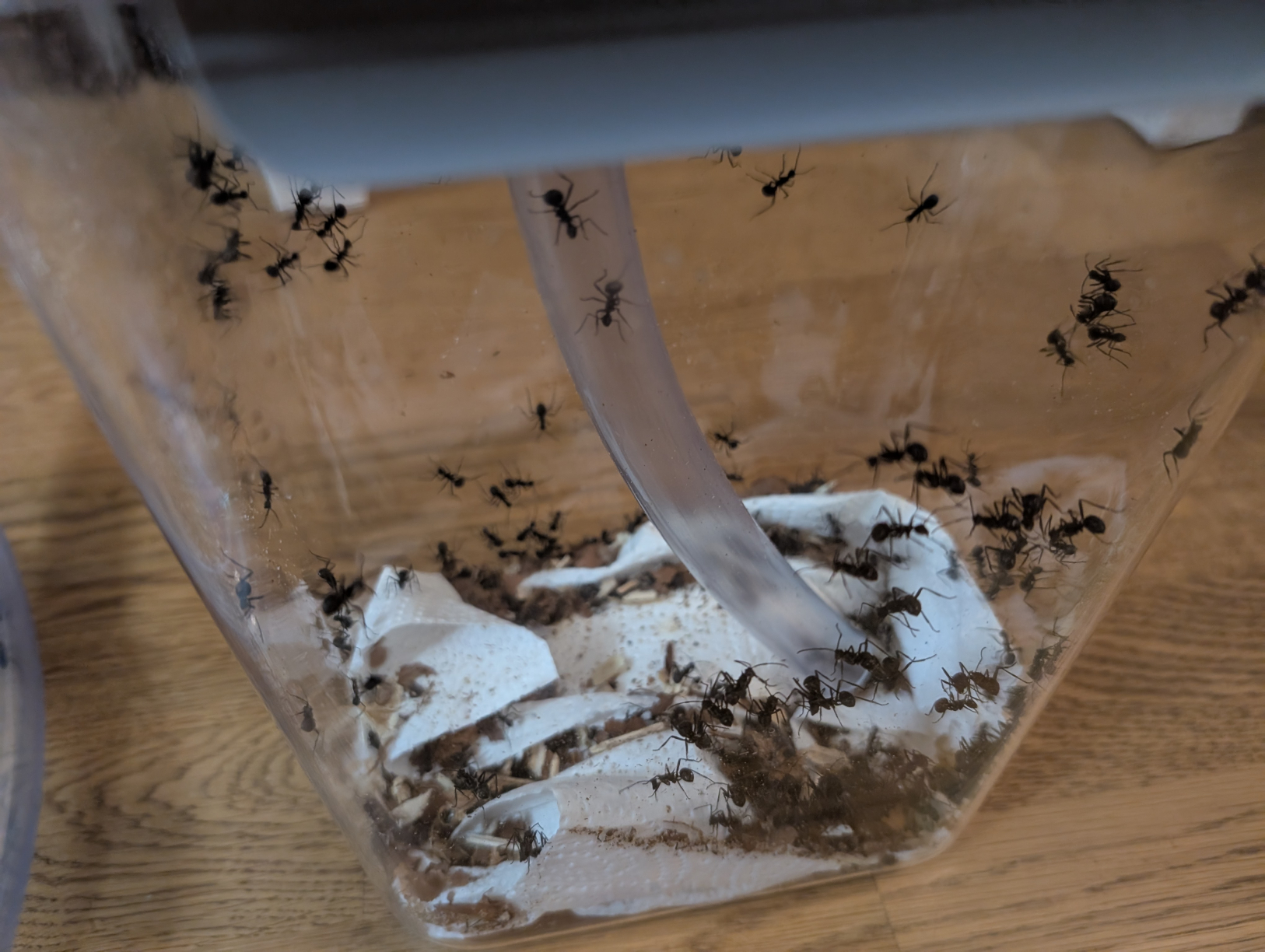 Die ideale Gelegenheit, um meinen neuen Ameisensauger zu verwenden! Im Grunde eine Box, zwei Löcher im Deckel mit SchlauchanschlĂŒssen. Der Ausgang zum Staubsauger mit Mesh/Gaze abgedeckt und einen Adapter fĂŒr einen AEG-Staubsauger gedruckt. Unten etwas auspolstern und Ausbruchsschutz am oberen Bereich der Box anbringen. Den Staubsauger auf niedrigster Stufe und offenem Handgriff betreiben. So sieht das ganze dann aus auch wenn die Adleraugen unter euch auf dem ein oder anderen Bild eine andere Kolonie entdecken werdenđ