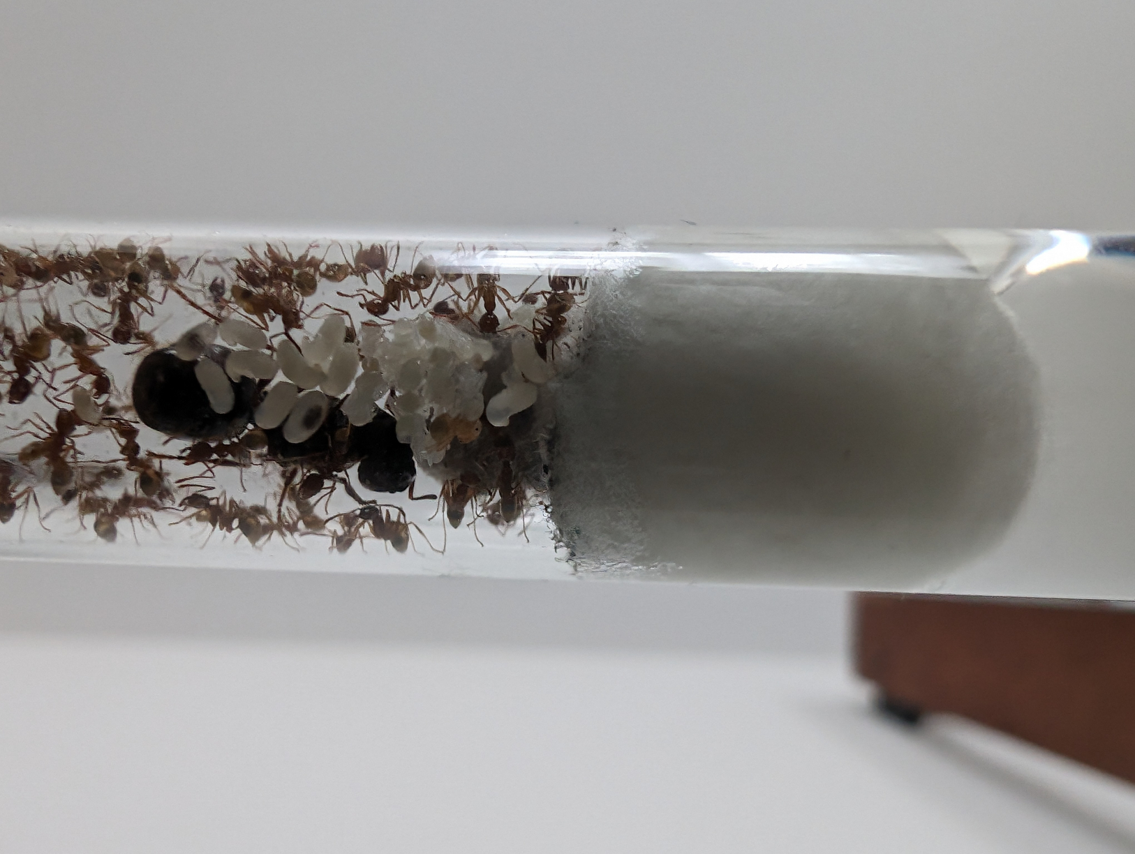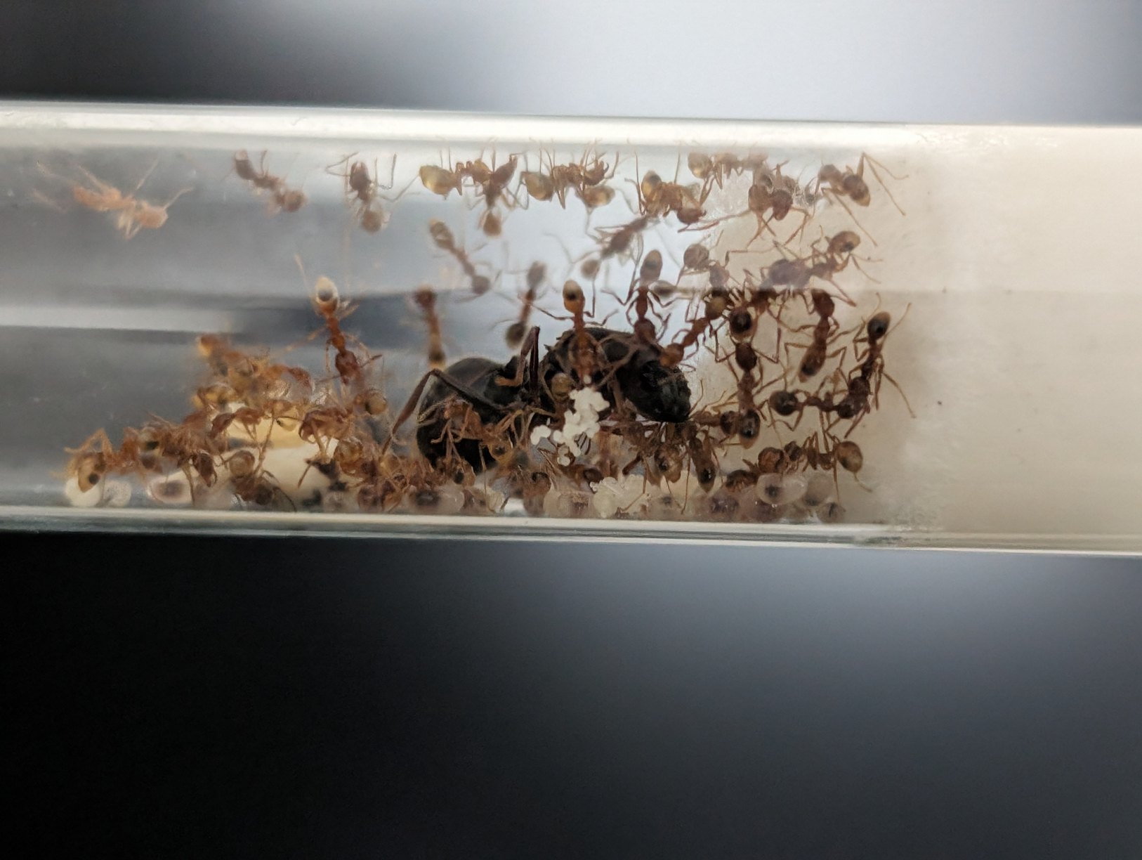 Grundsätzlich bin ich zufrieden muss aber gestehen, dass mich als Anfänger die Brutentwicklung, die toten Ameisen und die mäßige Futterannahme etwas verunsichert haben. Ich hatte über mehrere Tage versucht Schabenteile zu verfüttern, welche aber nahezu alle auf dem Müll gelandet sind. Erst als ich Fischchen angeboten hatte, wurde wieder sichtbar und mit hoher Aktivität gefressen/eingetragen. Die Proteinzufuhr war dadurch fast eine Woche unterbrochen. Wahrscheinlich am Ende alles kein Problem.