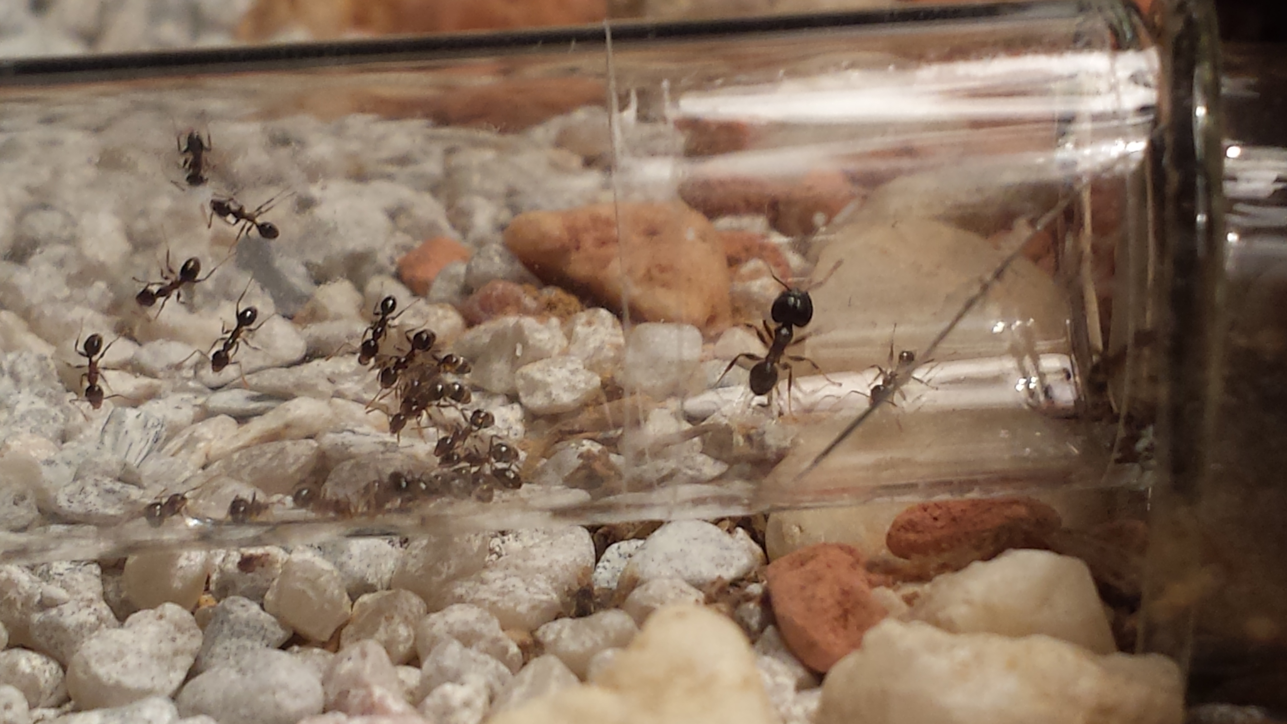 Weihnachtsexperiment: Ich habe den Ameisen Kinderschokolade und Marzipan gegeben. Die Kinderschokolade wurde überklettert, aber in das Marzipan wurde einpaarmal reingebissen und sie haben sich sehr erschreckt und sind zurück gesprungen.