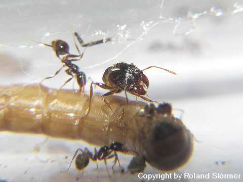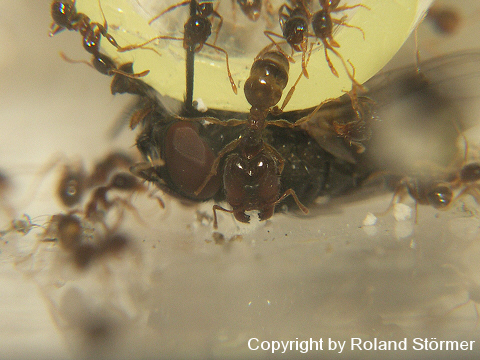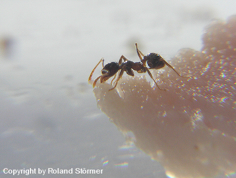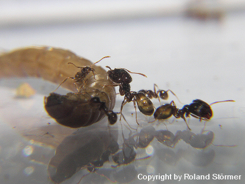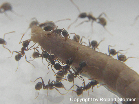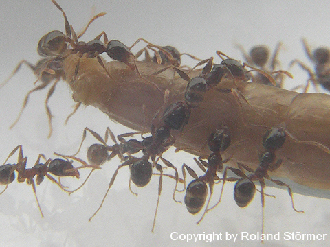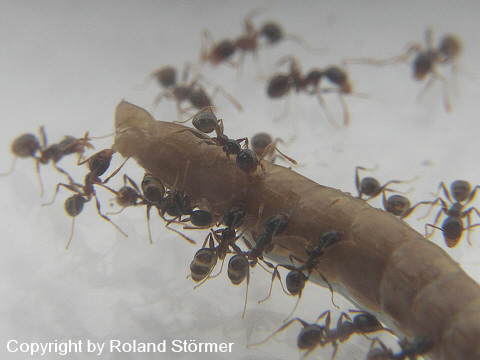 Bei dem 6. Bild, speist die Pheidole pallidula an einer Fleischwurst.