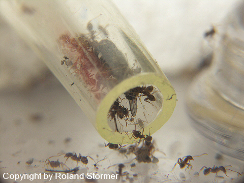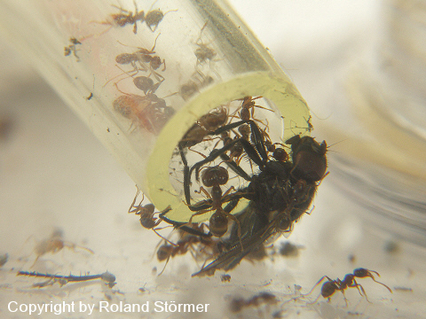 Heute stand mal wieder Stubenfliege auf dem Speiseplan. Da konnte ich beobachten, wie die Ameisen ihre Beute durch den Schlach ins Nest getragen haben. Gut das ich den Schlauch nicht zu klein gewÀhlt habe.