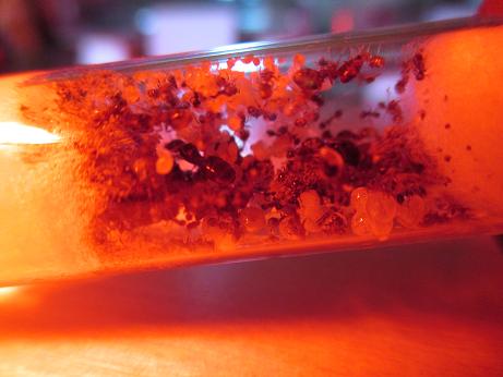 Ah ja! Wisst ihr, was ich am Abend vor drei Tagen beobachten konnte? Jep jep, die Kolonie begann tatsächlich mit dem Umzug in das neue Reagenzglasnest. Ich fand das natürlich ganz super, vor allem weil wieder die Wärmelampe wohl schlußendlich ausschlaggebend war ;). Heute kontrollierte ich kurz das neue RG, und mich wunderte es schon kurz, warum es optisch irgendwie an Ameisenfleisch fehlte!? Bei der Fütterung entfernte ich dann aber schlußendlich auch die Alufolie vom alten RG, und da entdeckte ich dann noch den fehlenden Rest, nämlich die dicken, rundlichen Geschlechtstierlarven mit einer wachenden Gruppe bestehend aus rund siebzehn Arbeiterinnen und einer Soldatin. Die Alufolie habe ich nun komplett entfernt, schlußendlich soll dann das alte RG als Wassertank dienen.