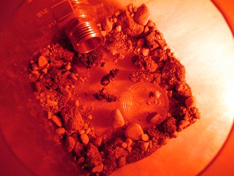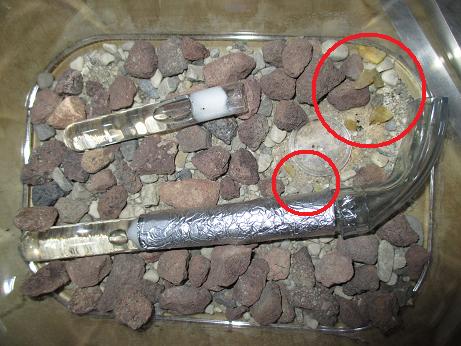Schlechte Neuigkeiten! Schon wieder fanden vier Arbeiterinnen im Paraffinöl ihr Ende. Diesesmal merkte ich, dass erneut (also unkontrolliert) Paraffinöltropfen herunter liefen und sich so die Ameisen verfingen. Jetzt hab ich mit Vulkangestein die Ränder am Boden damit abgedeckt, in der Hoffnung das das nicht mehr passiert :(.