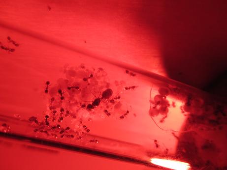 Die Brut ist ebenso sehr zahlreich, jede Menge Nacktpuppen, Larven und Eier was das Zeug hält! Was mich besonders gewundert hat... auch Geschlechtstierlarven sind vorhanden. Naja, ist ja aber auch nicht so pallidula-untypisch, die machen das gerne mal ab einer gewissen Völkeranzahl! ;)