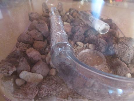 Mit Lavagestein und feineres Schottermaterial (im Grunde das selbe Material wie in der alten Kleinarena) gestaltete ich unkompliziert die neue Arena. Das RG-Nest wurde mittig platziert, ein Stück vom Schlauch lies ich dran und am Behälterrand absichtlich etwas einquetschen, damit sich Erstens nix mehr bewegen kann (also das RG-Nest!) und Zweitens das gesamte Nesteingangsgefühl für meine Zwerge für optimaler erscheint. (aus der Freilandbeobachtung weiß ich, dass sie ihre Nesteingänge primär sehr klein hielten und nur zum Schwarmflug oder für riesige Beute vergrößerten!)
