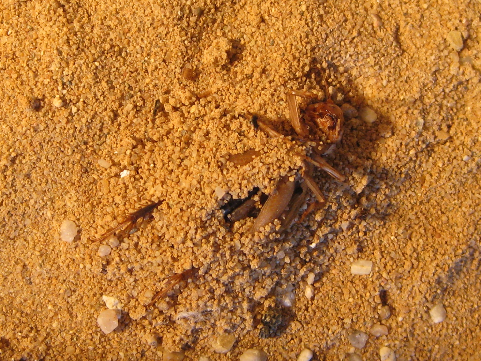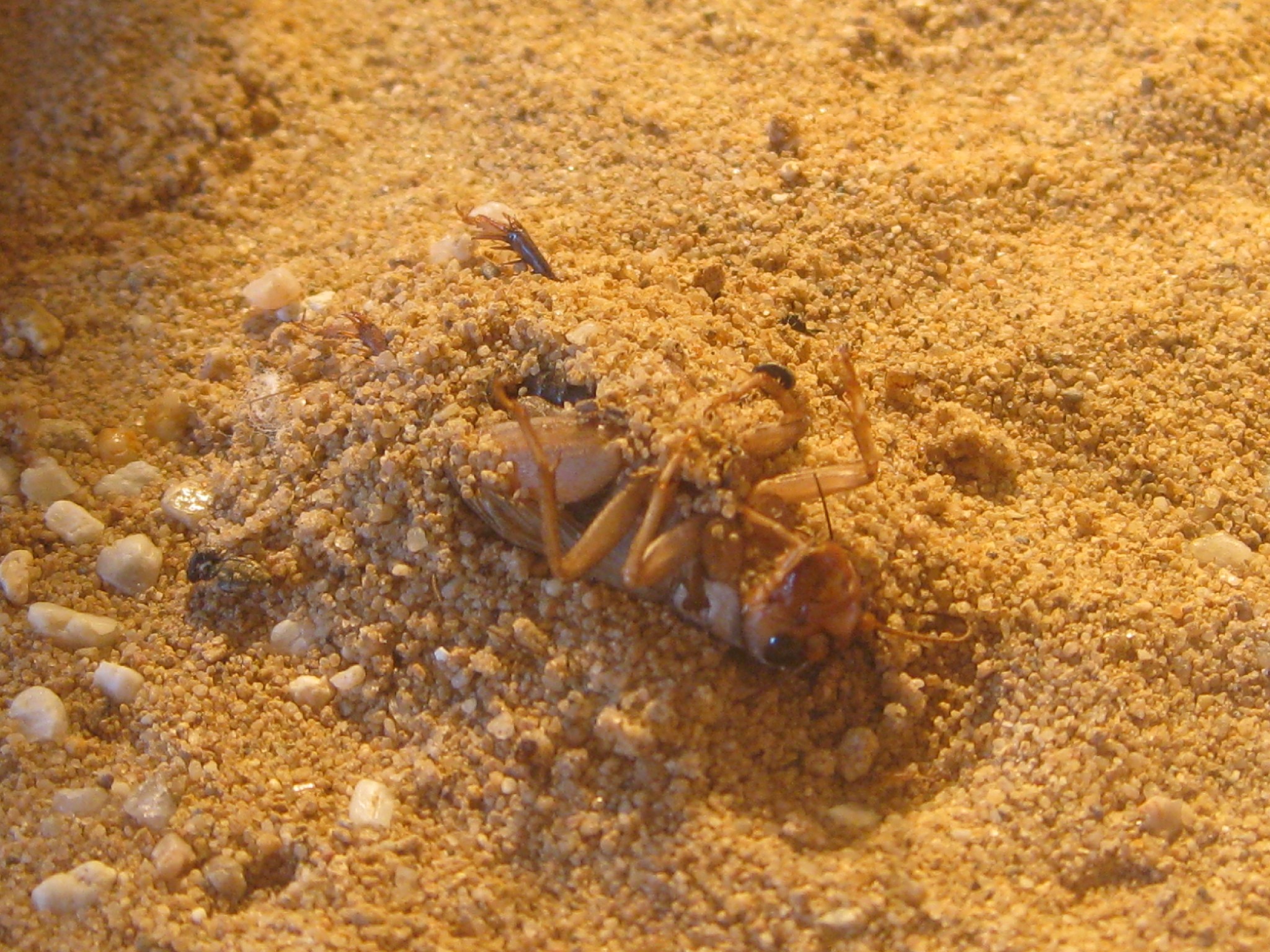 Einmal gab ich die letzten Tage eine Steppengrille hinein. Diese Wurde sozusagen angefressen und danach eingebuddelt. Also sie fraßen daran herum und buddelten sie gleichzeitig ein. Dieses Verhalten ist mir nicht verständlich. Klar die Grille ist für die Kolonie doch noch etwas zu groß gewesen aber warum dann eingraben? Zugleich bemerkte ich das sie genau die Stelle zur Mülldeponie machten.^^