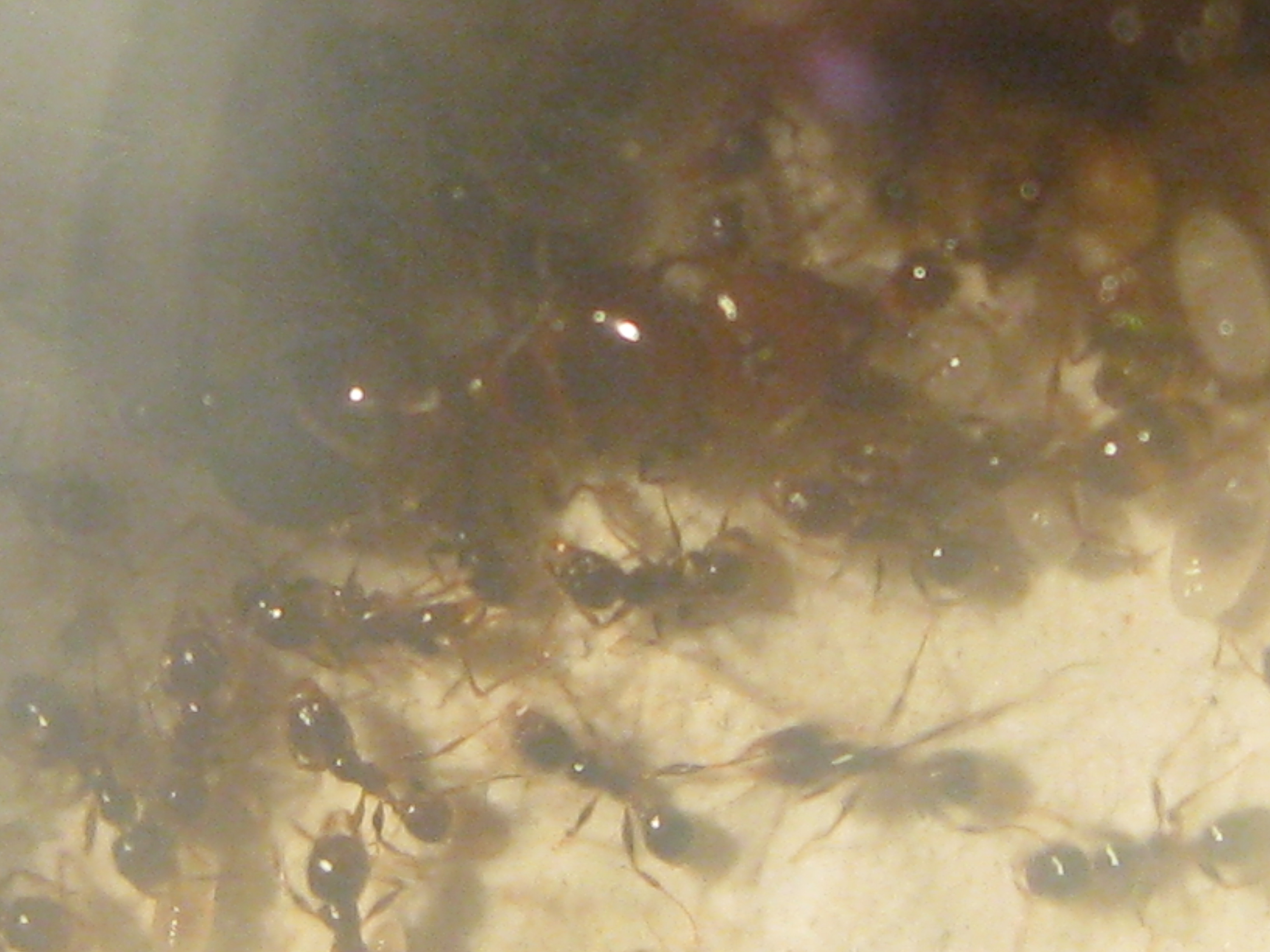 Honig nehmen sie nun viel heftiger an als frĂĽher. FrĂĽher war es so das 2-3 Arbeiterinnen sich fĂĽr den Honig interessierten und er dann liegen blieb oder mit Dreck voll gekleistert wurde. Aber als ich im Becken Honig an bot war er sofort umkreist von Arbeiterinnen. Also wirklich drum herum sie saĂźen fast wie bei meiner alten Myrmica rubra Volk aufeinander. Aber das leide rauch nicht lange und nach einem halben Tag wurde der dann auch mit Sand voll gekleistert und nicht mehr beachtet.