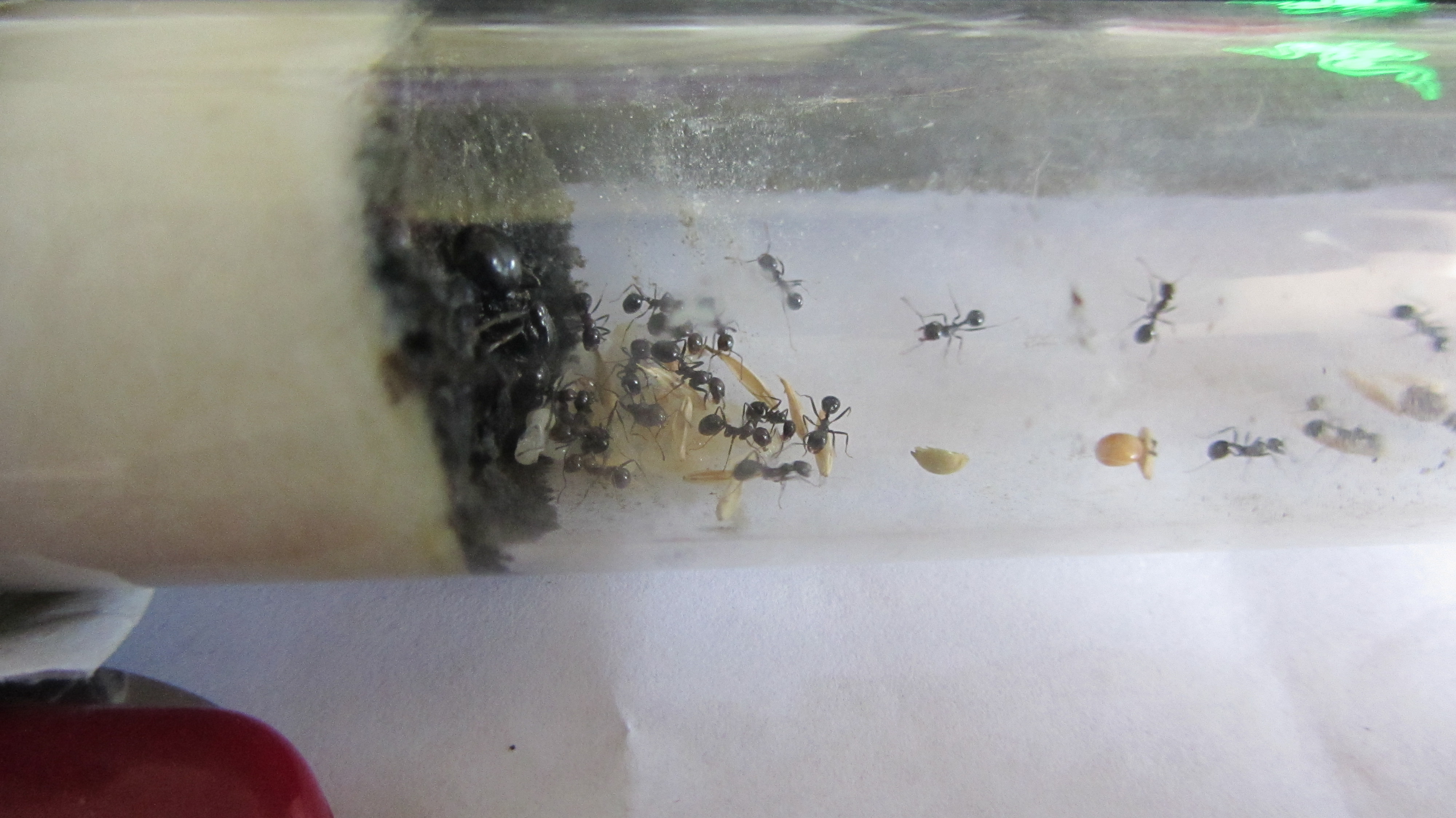 Auch hier ein Update, aus den 9 Pygmäen sind nun schon ganze 23 geworden, auch sind die ersten Größeren Arbeiterinnen unter ihnen. Auch kann man gut das Eintragen von Körnern bzw. Grassamen beobachten.