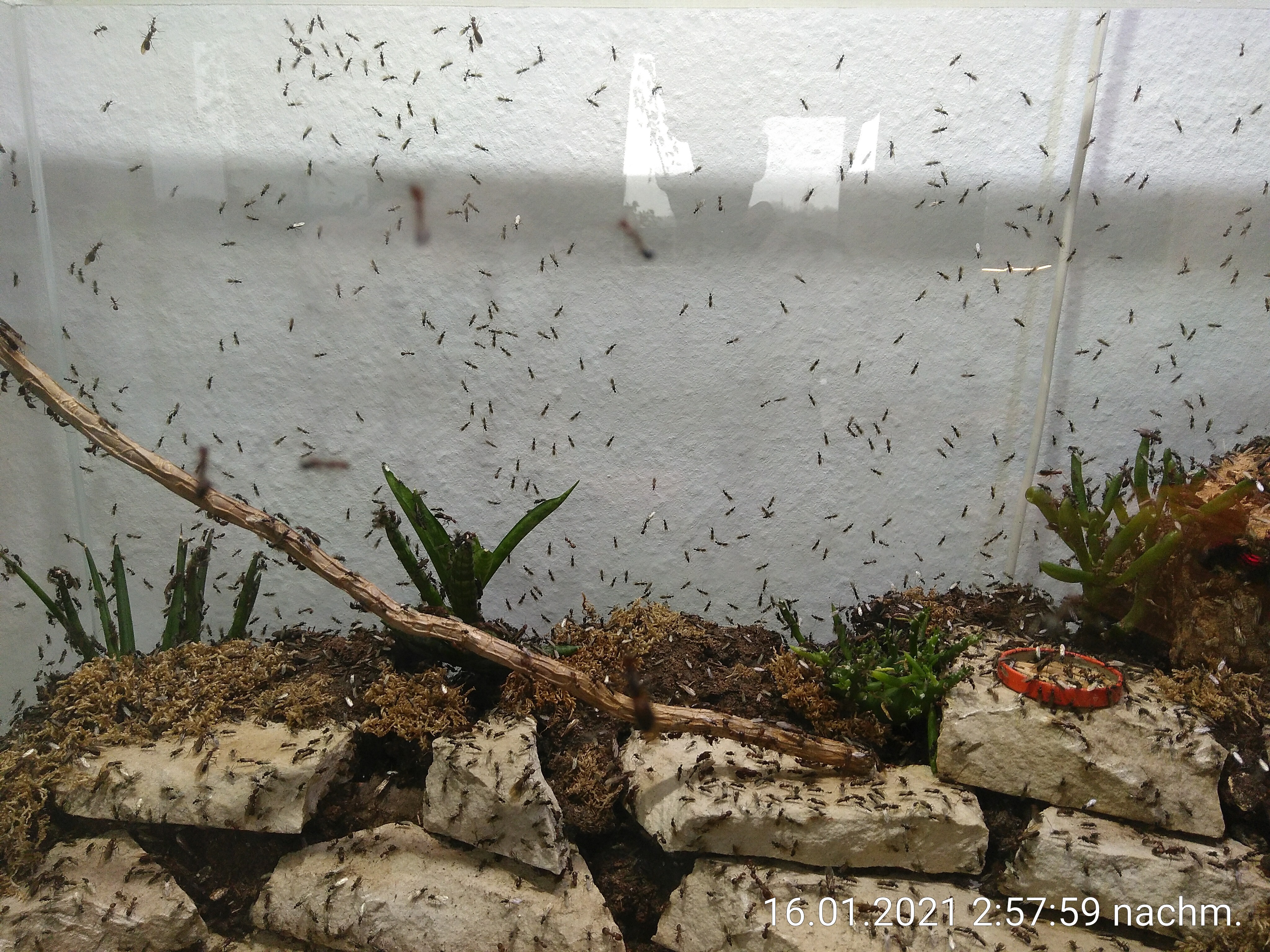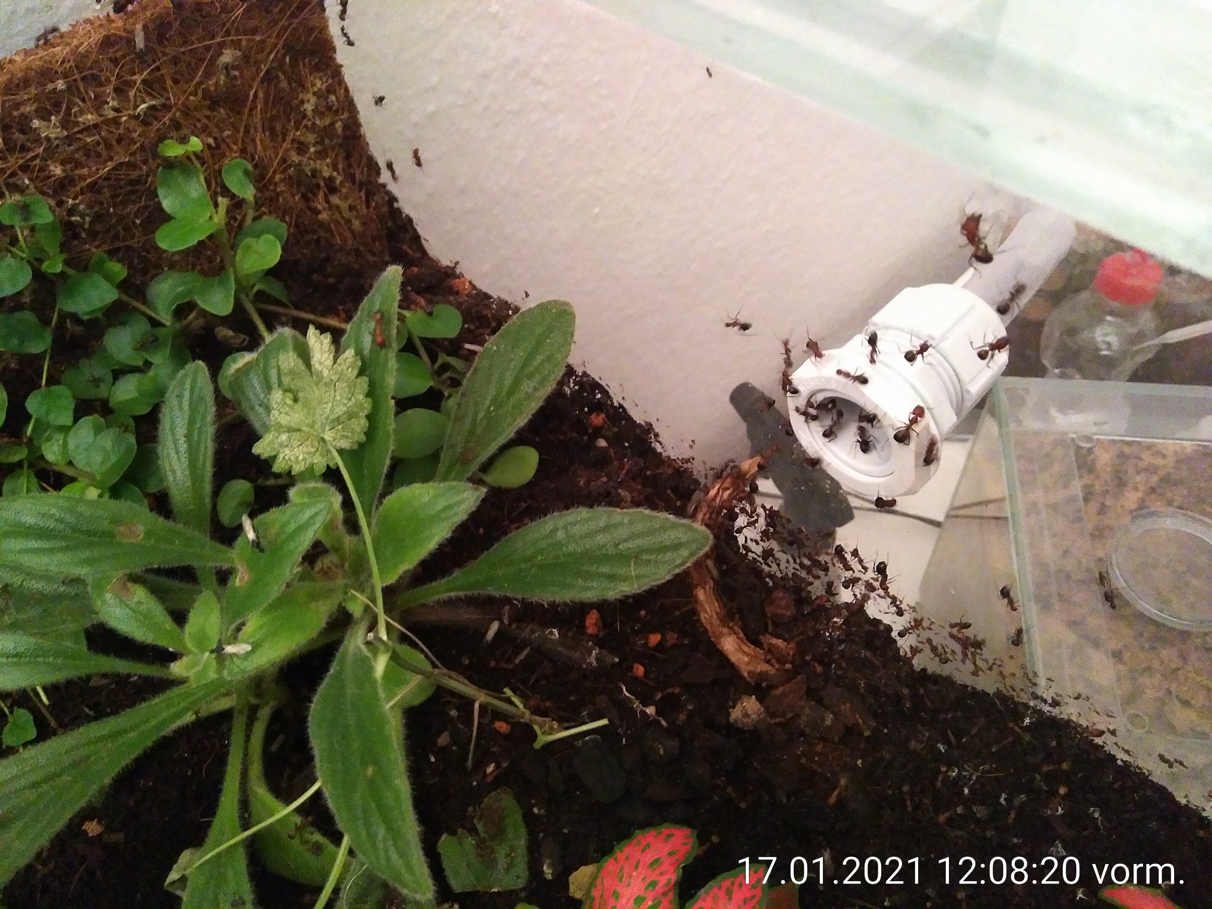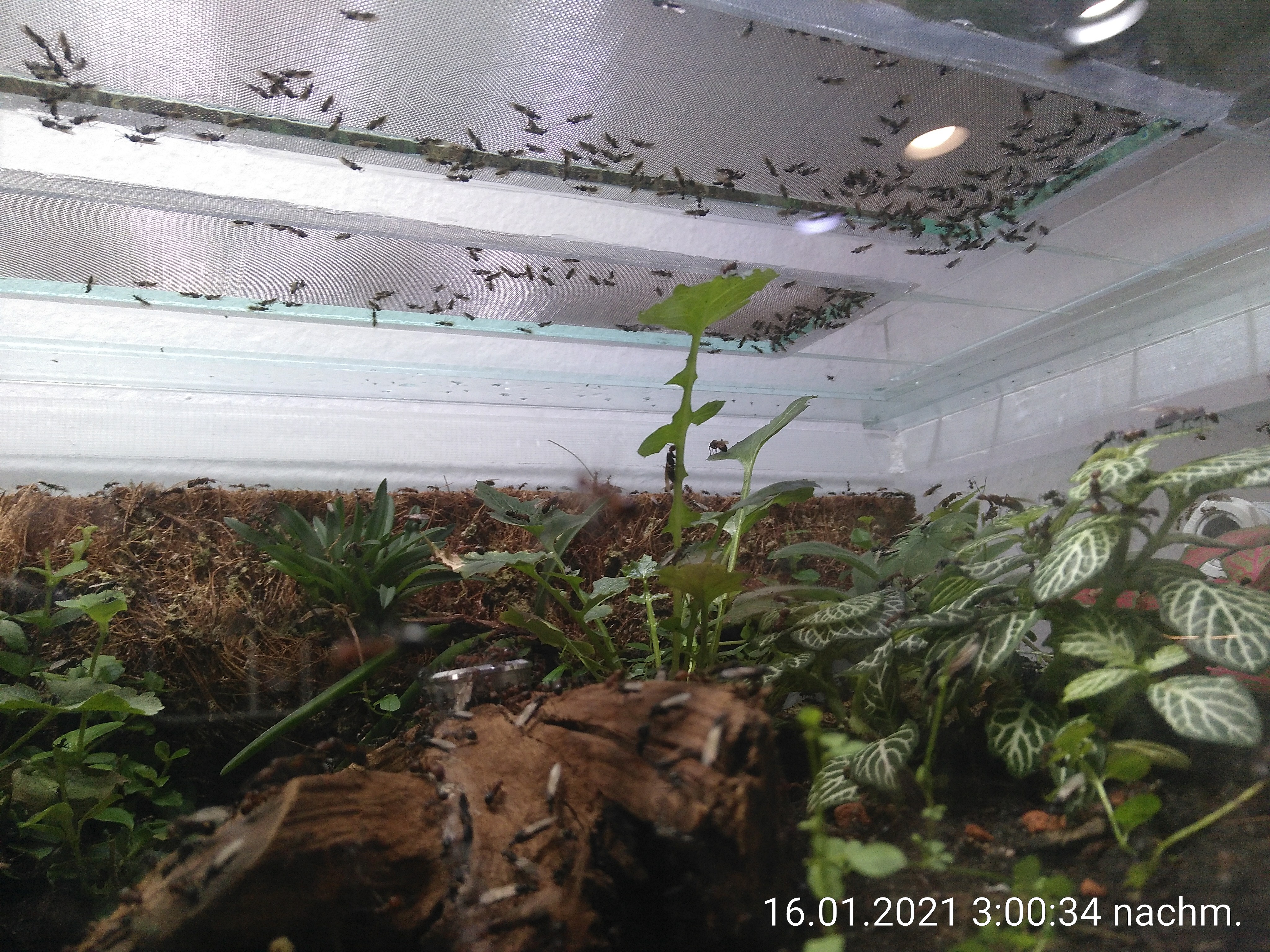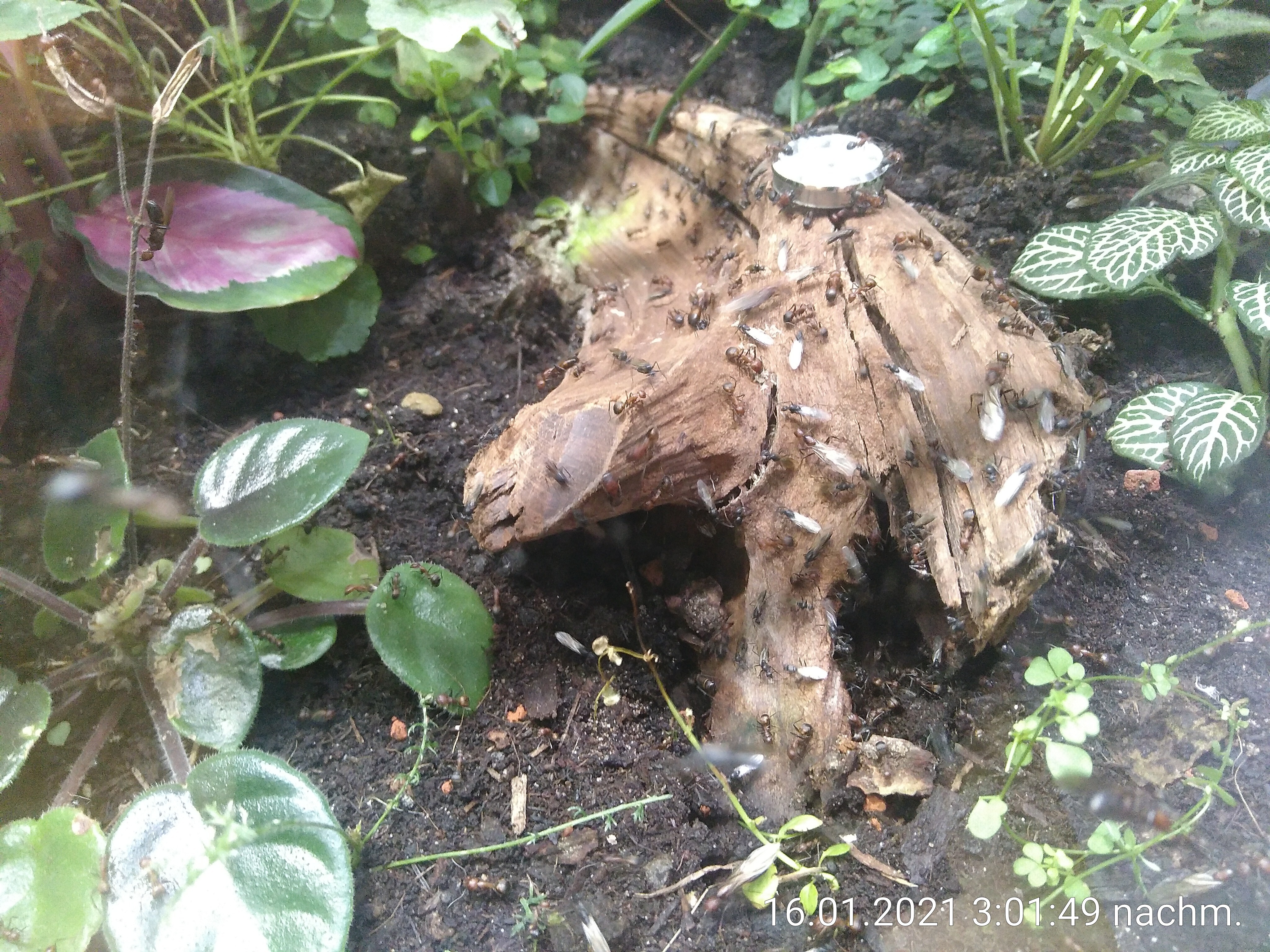 Und wenn ich den Deckel aufmache, kommen mir bestimmt Hunderte nicht gerade erfreute Ameisen entgegen. Ich müsste das Nest also erstmal vom System trennen und dann in eine Wanne oder so stellen, bevor ich es öffne. Es wäre schön, wenn man sie so wie Bienen z.B. mit ein bisschen Rauch friedlicher und passiver stimmen könnte. Von so einem Trick habe ich allerdings noch nie etwas gehört.