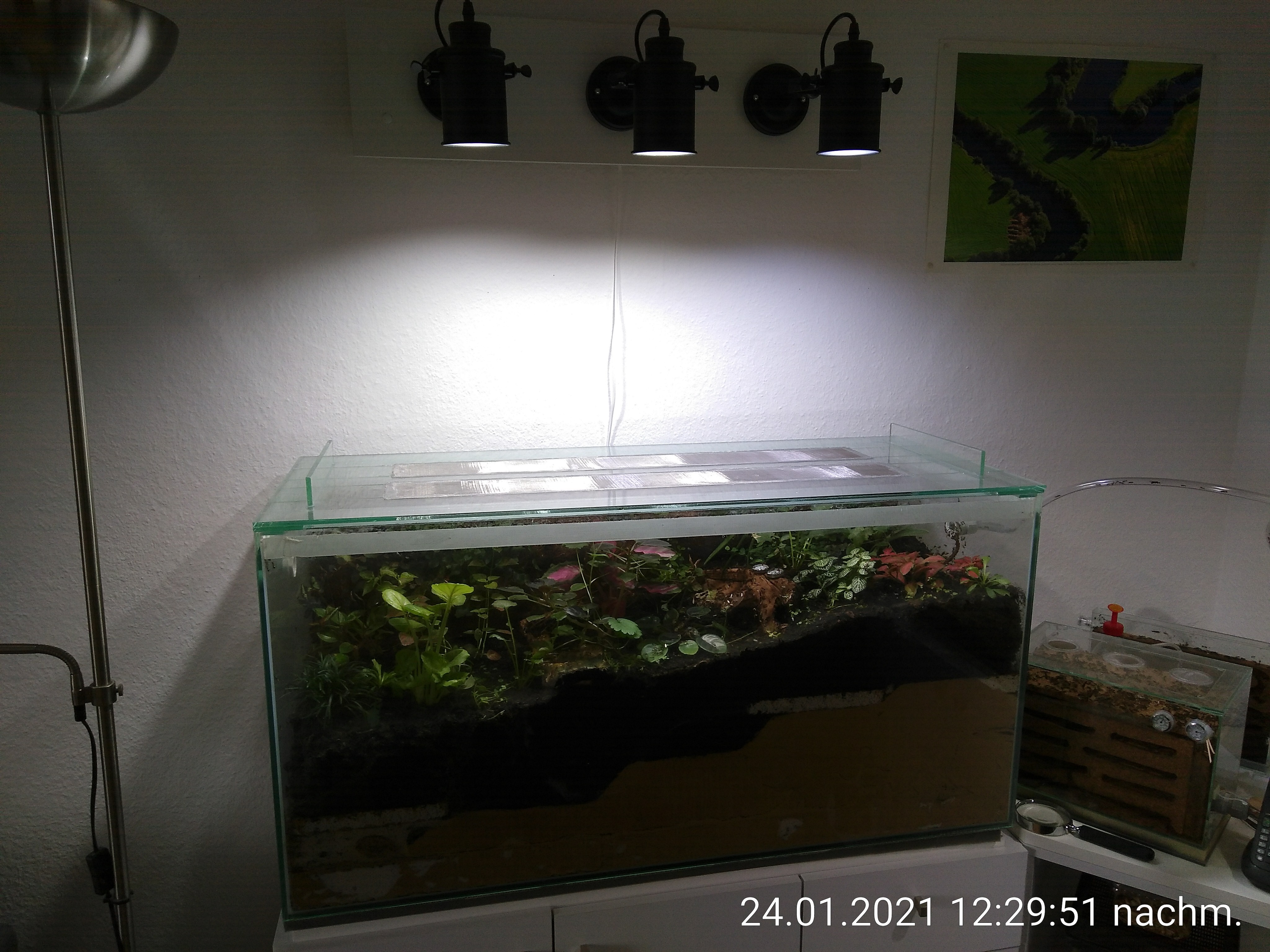 Natürlich brauchen die Pflanzen viel Licht. Da sie in der hintersten Ecke des Wohnzimmers stehen, bekommen sie gerade im Winter durch das Fenster nicht genug davon. Aber auch sonst würde es nicht reichen. Ohne Angebot von künstlichen Licht würden sie sicherlich alle in eine Richtung wachsen oder eingehen. Ich habe mich daher entschieden, 3 LEDs aufzuhängen, die Sonnenlicht imitieren und das Becken gut ausleuchten. Davon habe ich auch schon 2 über dem alten Becken hängen. Die Pflanzen gedeihen gut darunter und ich brauche insgesamt weniger als 20 Watt Strom (per Zeitschaltuhr gesteuert).