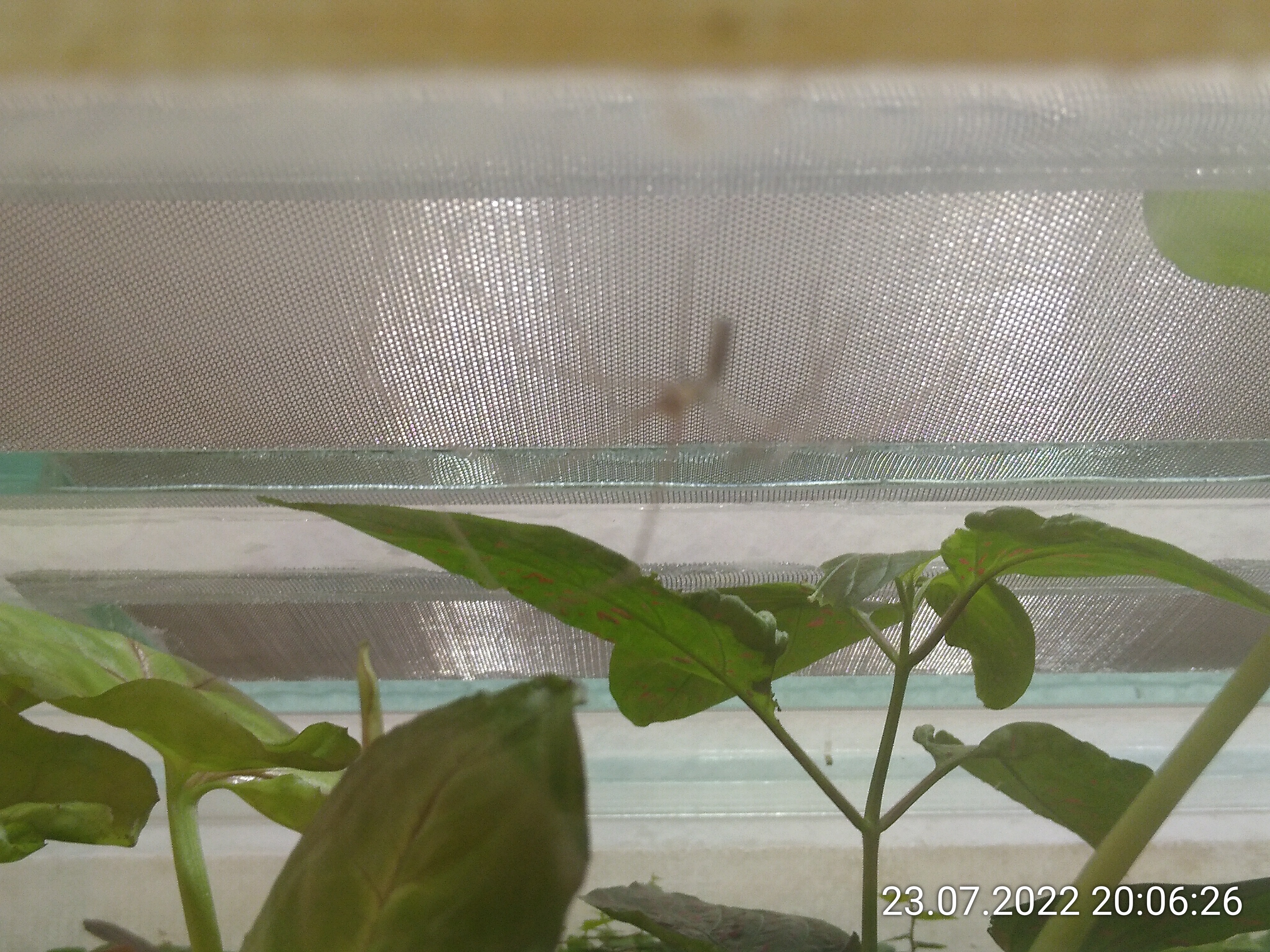 Wie ihr seht, habe ich die Watte wieder entfernt und kurz danach die linke Pflanze abgeschnitten. Im Anschluss habe ich dann die Watte durch ein Fliegennetz ersetzt.